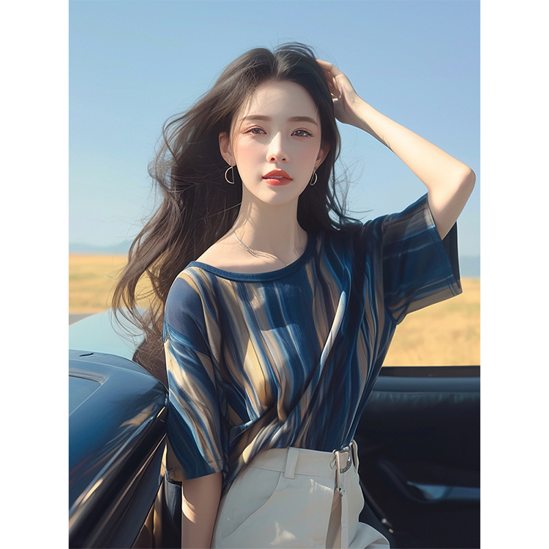 法式小众感设计洋气独特超好看别致上衣休闲蓝色条纹短袖t恤夏季