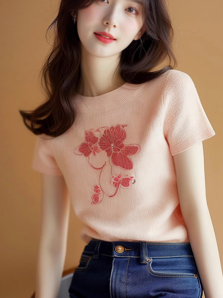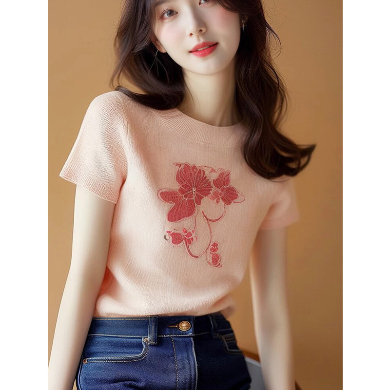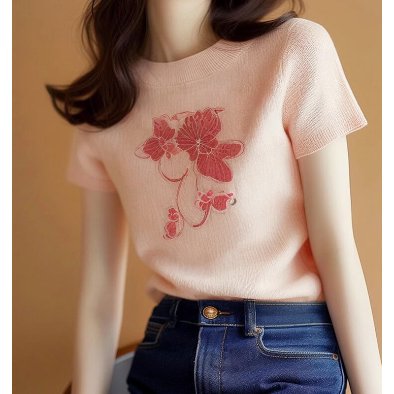 新款爆款设计感夏季气质上衣粉色针织修身正肩短袖t恤女夏款