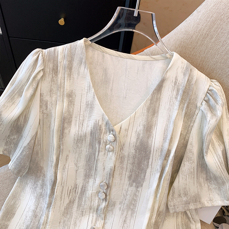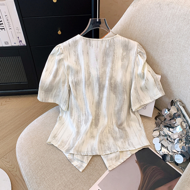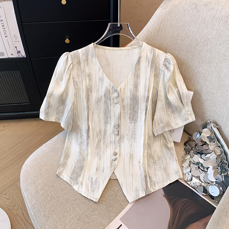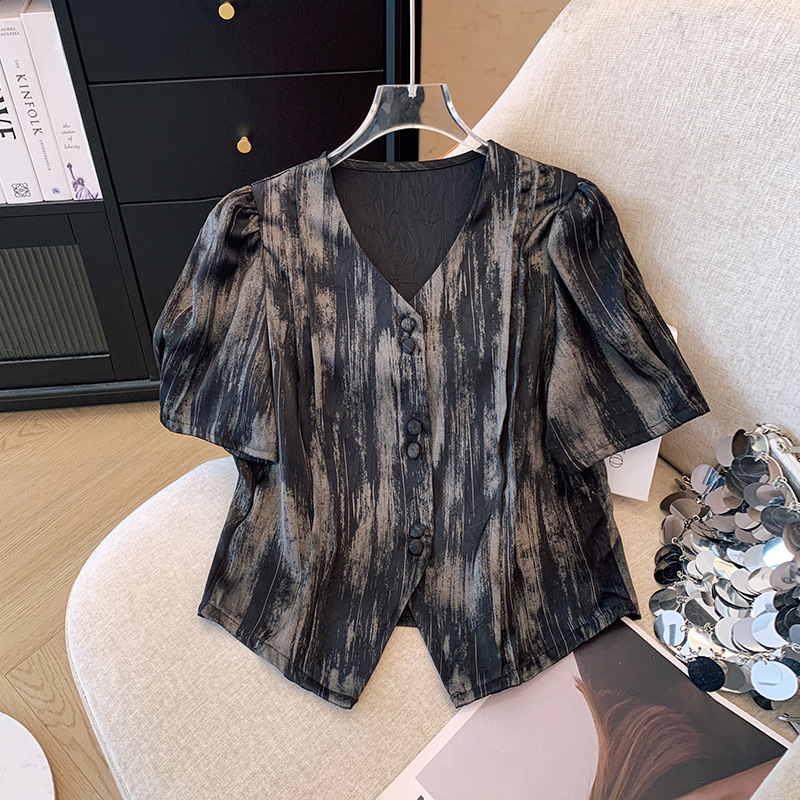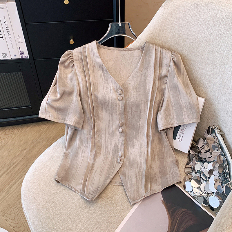 小香风衬衫女V领短款上衣夏新款国风缎面别致泡泡袖短袖衬衣