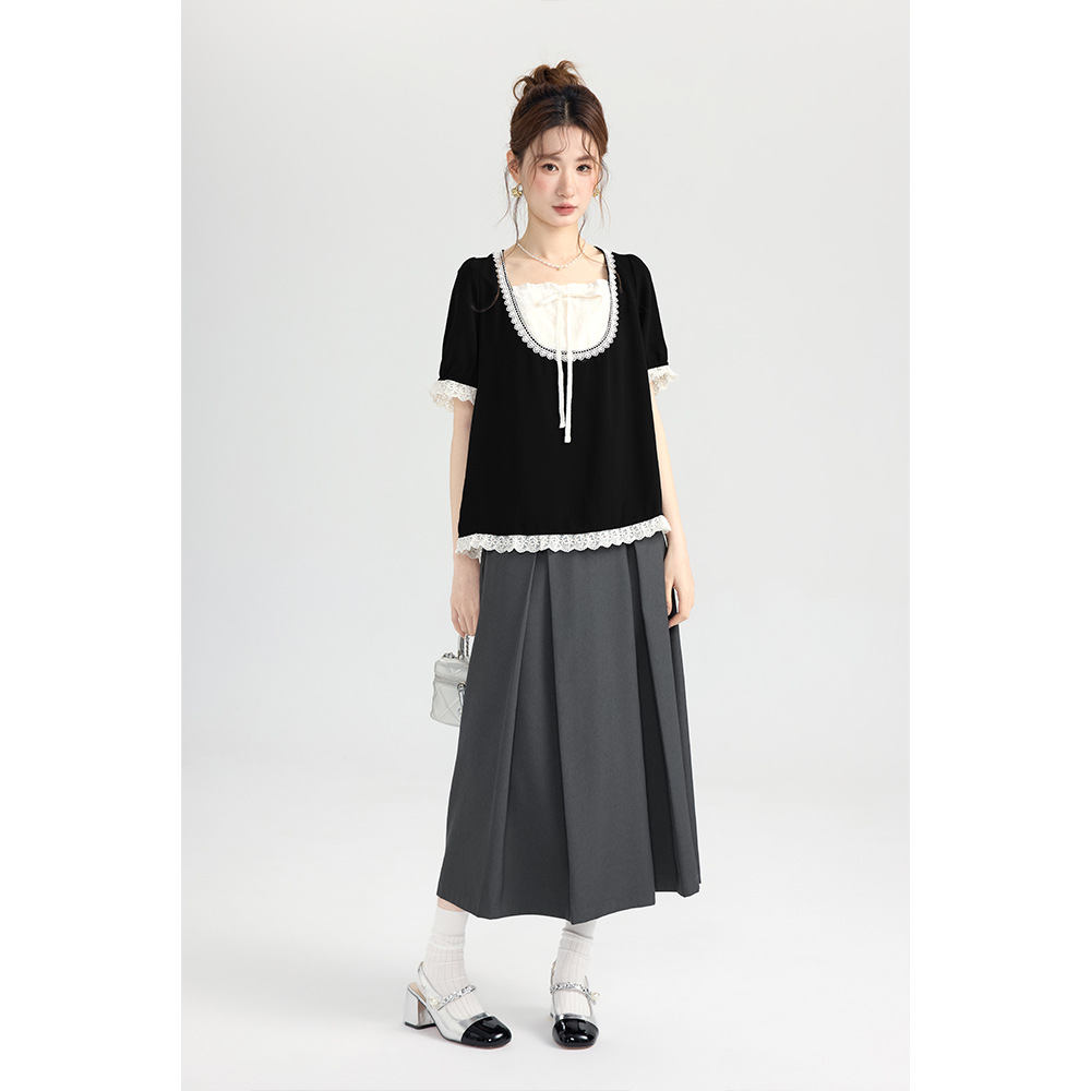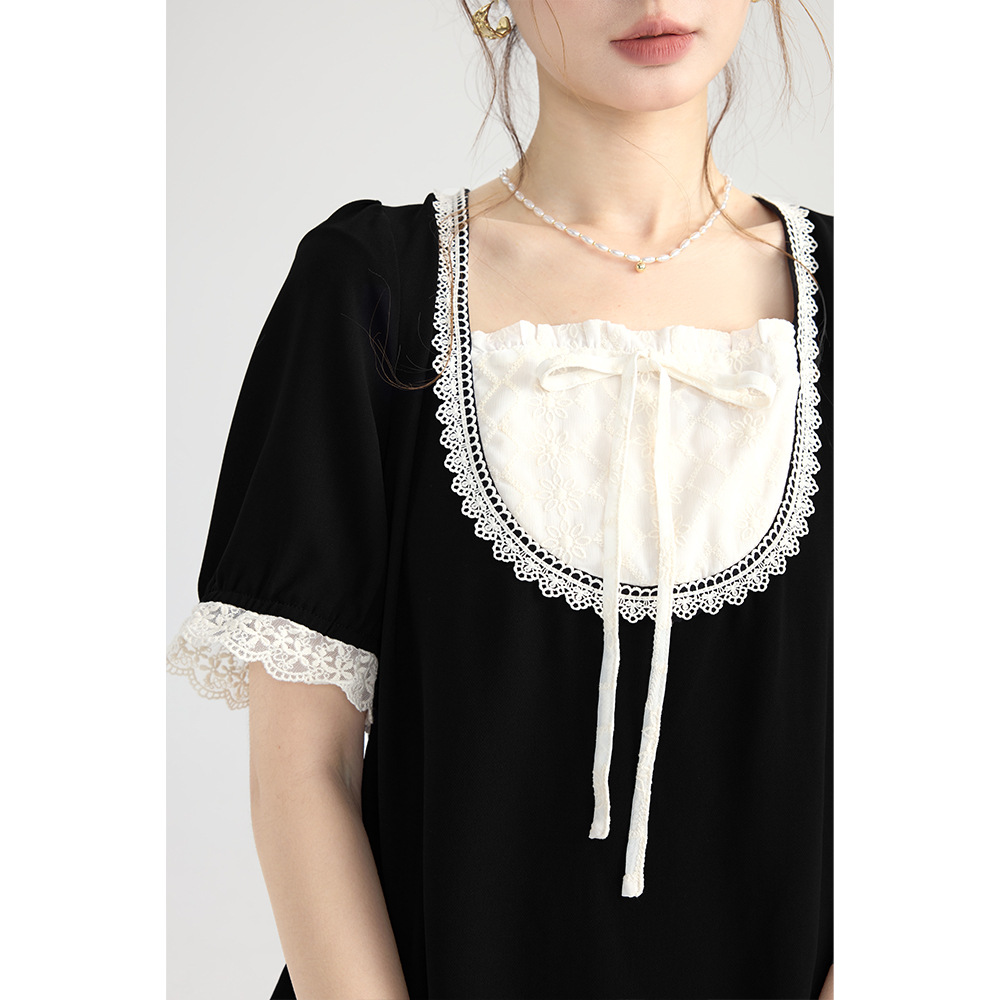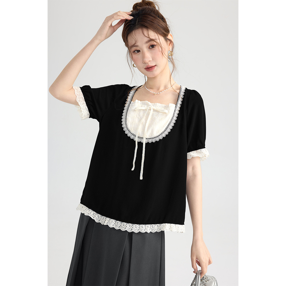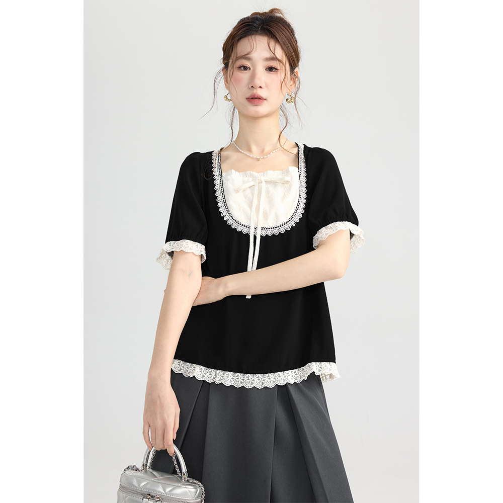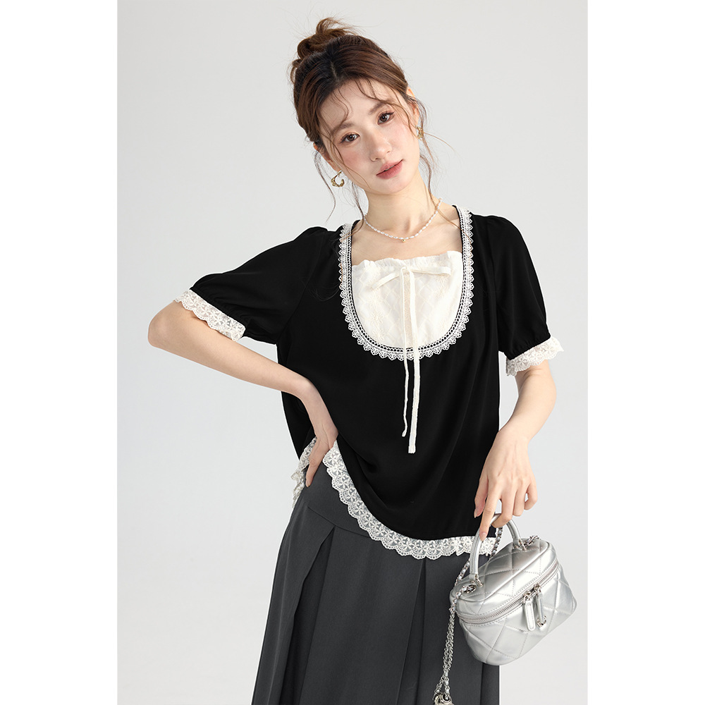 夏装蕾丝拼接蝴蝶结衬衫女新款法式锁骨方领上衣女