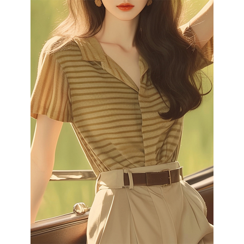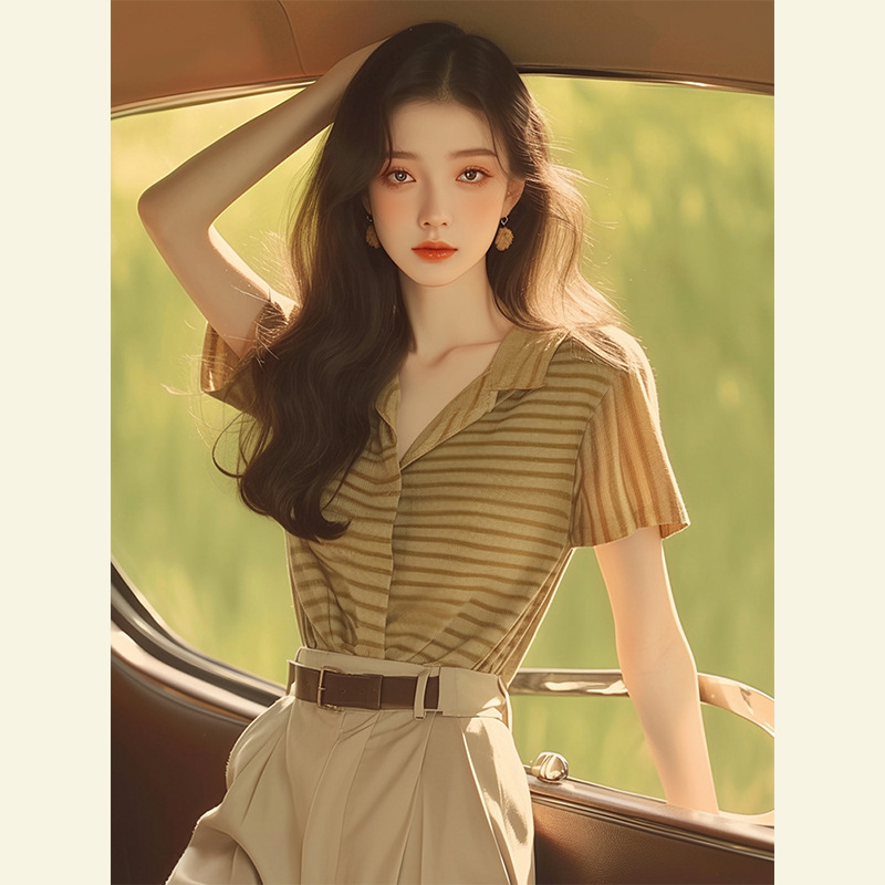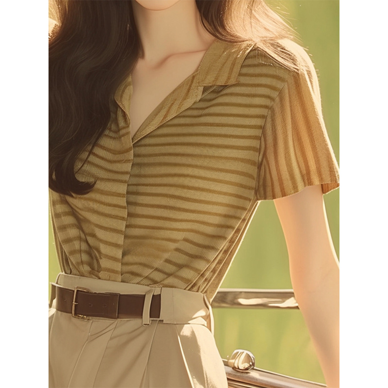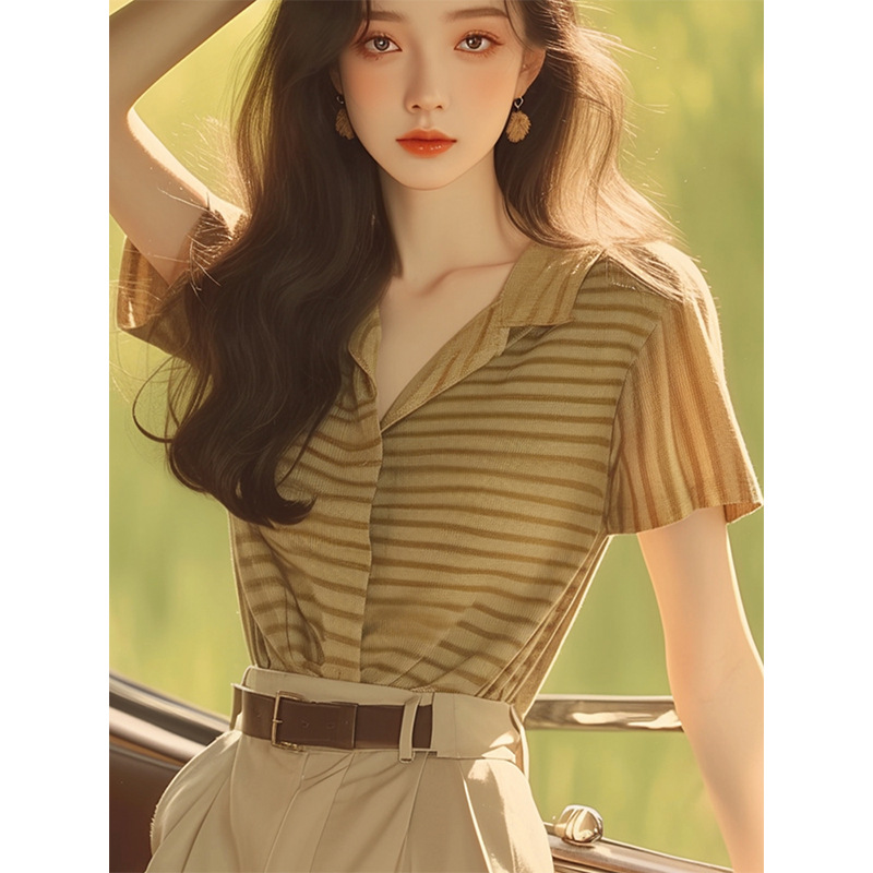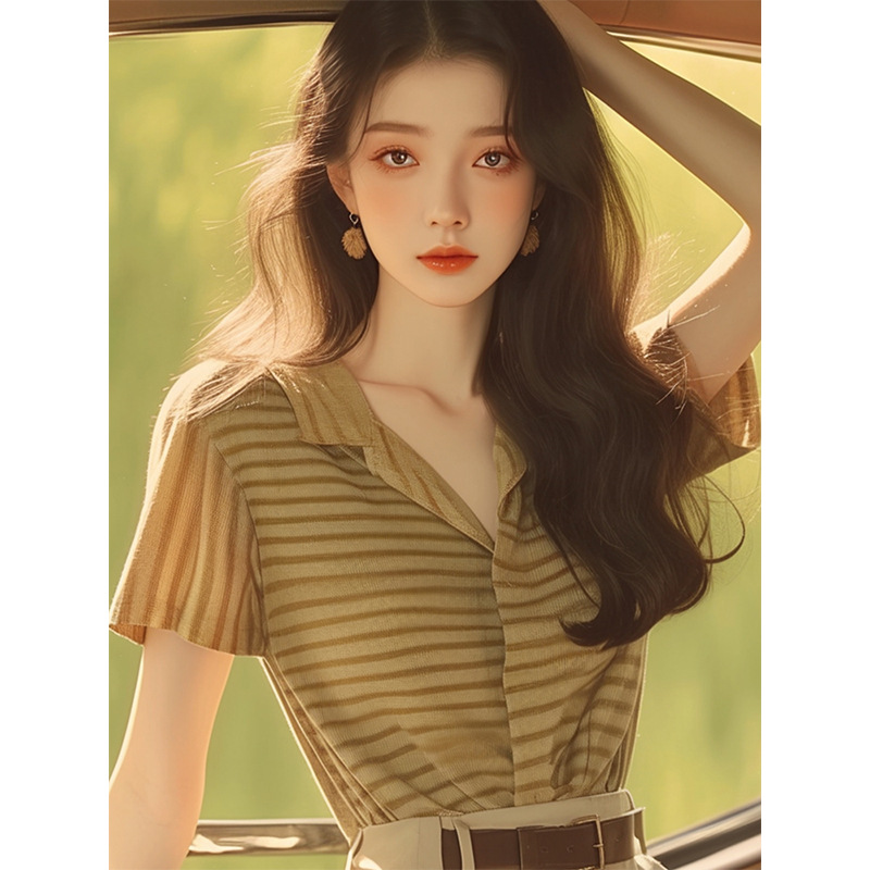 年夏季今年流行爆款独特上衣超好看港风复古绿色条纹短袖T恤