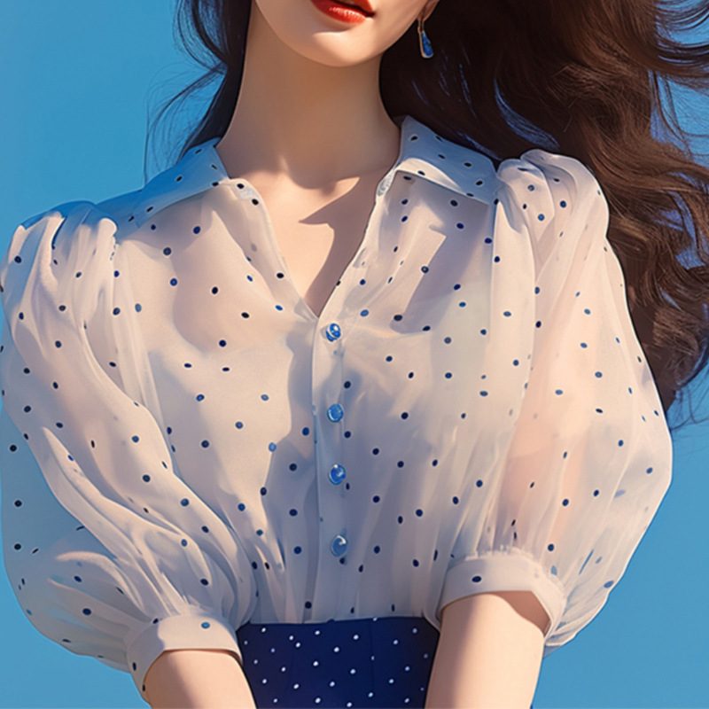 时尚简约白色波点POLO领短袖衬衫女夏季新款气质百搭显瘦通勤衬衣
