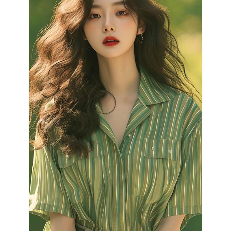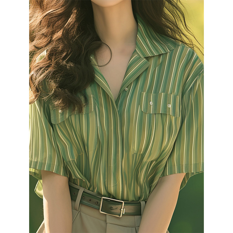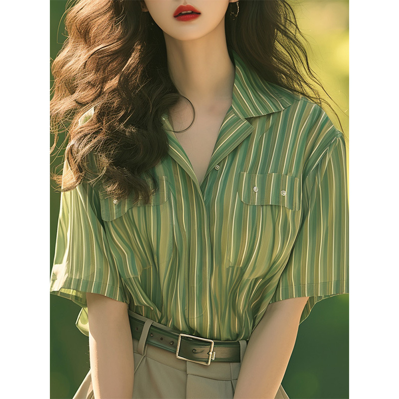 绿色条纹衬衫【2024新款夏款新中式国风法式独特小上衣