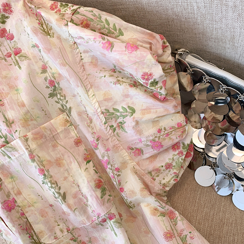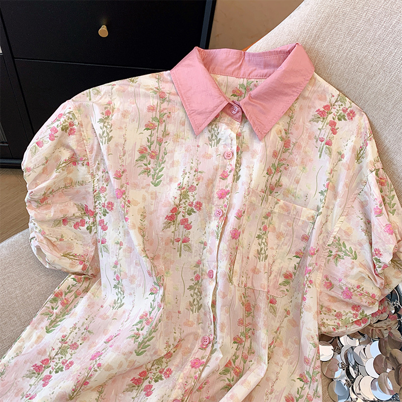 文艺碎花POLO领短袖衬衫女夏季新款洋气泡泡袖宽松上衣