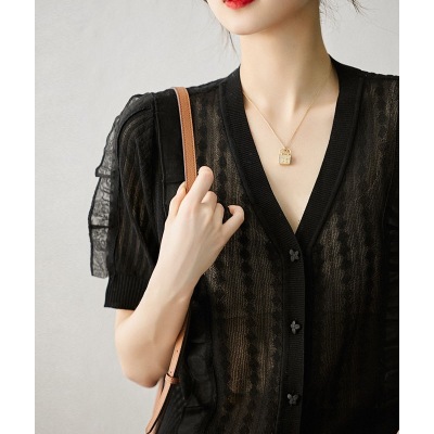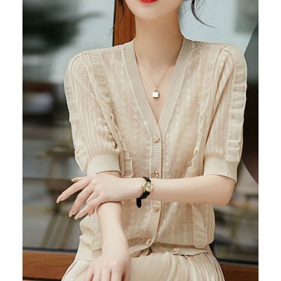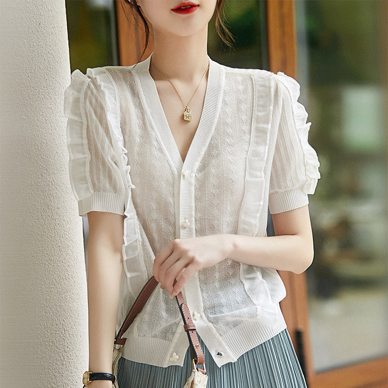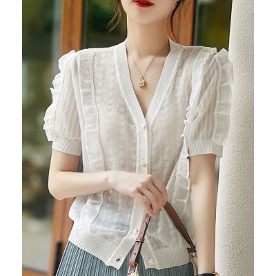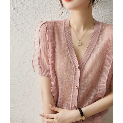 螺纹v领冰麻针织开衫上衣夏季时尚镂空网纱木耳拼接冰丝短袖小衫