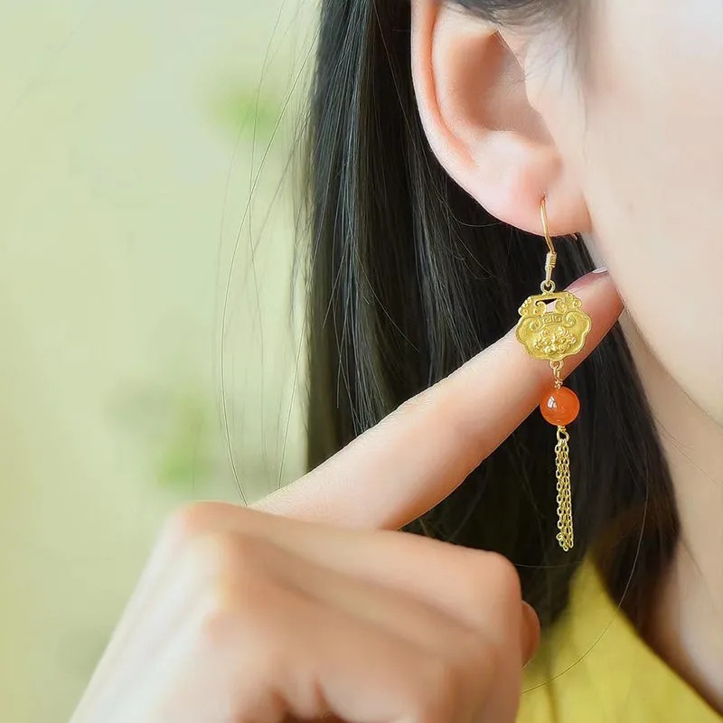 古法金狮南红流苏鎏金醒狮耳环樱桃耳坠女网红古风S925银耳饰