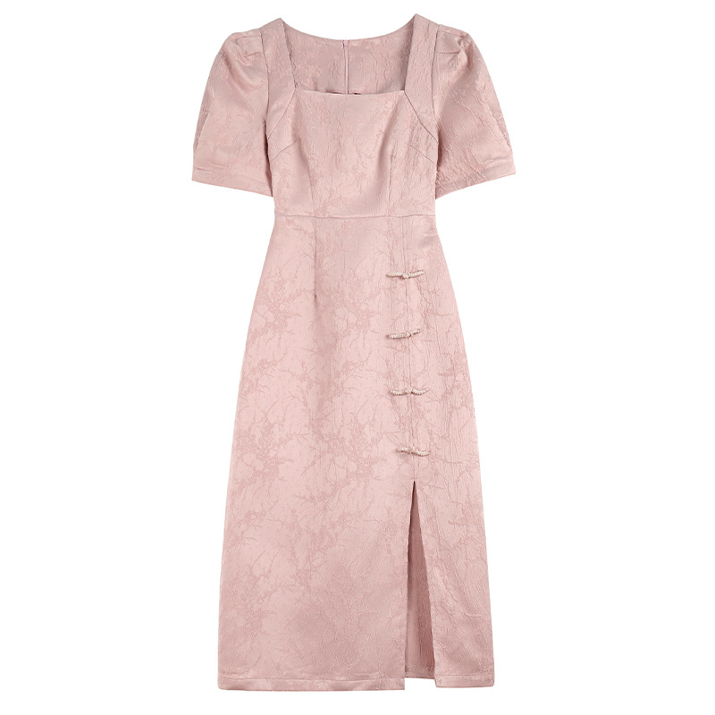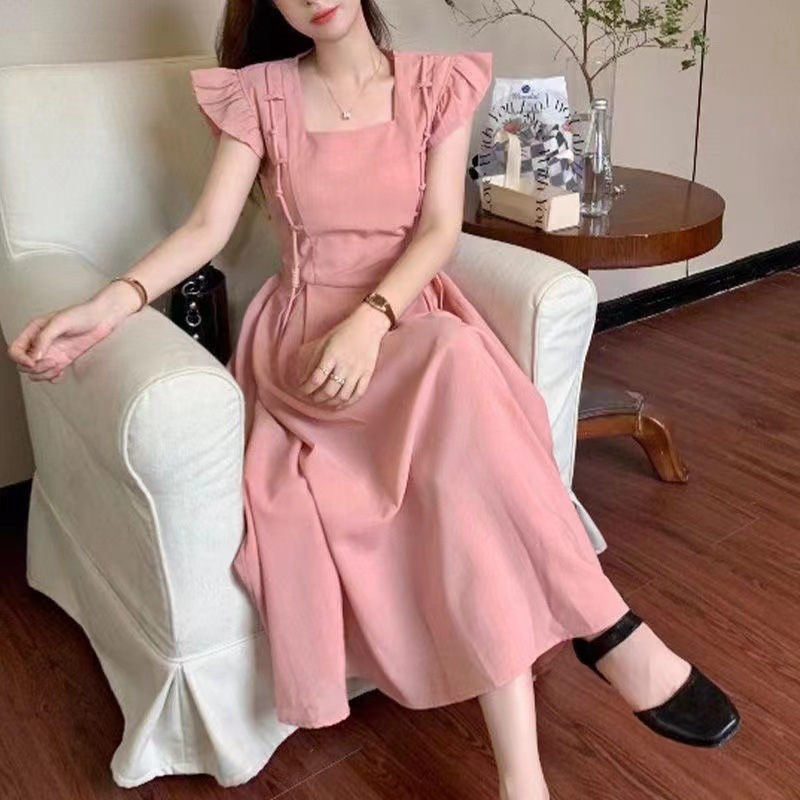 夏季新款法式减龄小飞袖连衣裙女设计感粉色气质收腰长裙子