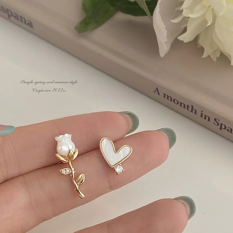 「偏爱」法式复古白色玫瑰花小巧精致耳钉环爱心不对称蚊香盘耳夹