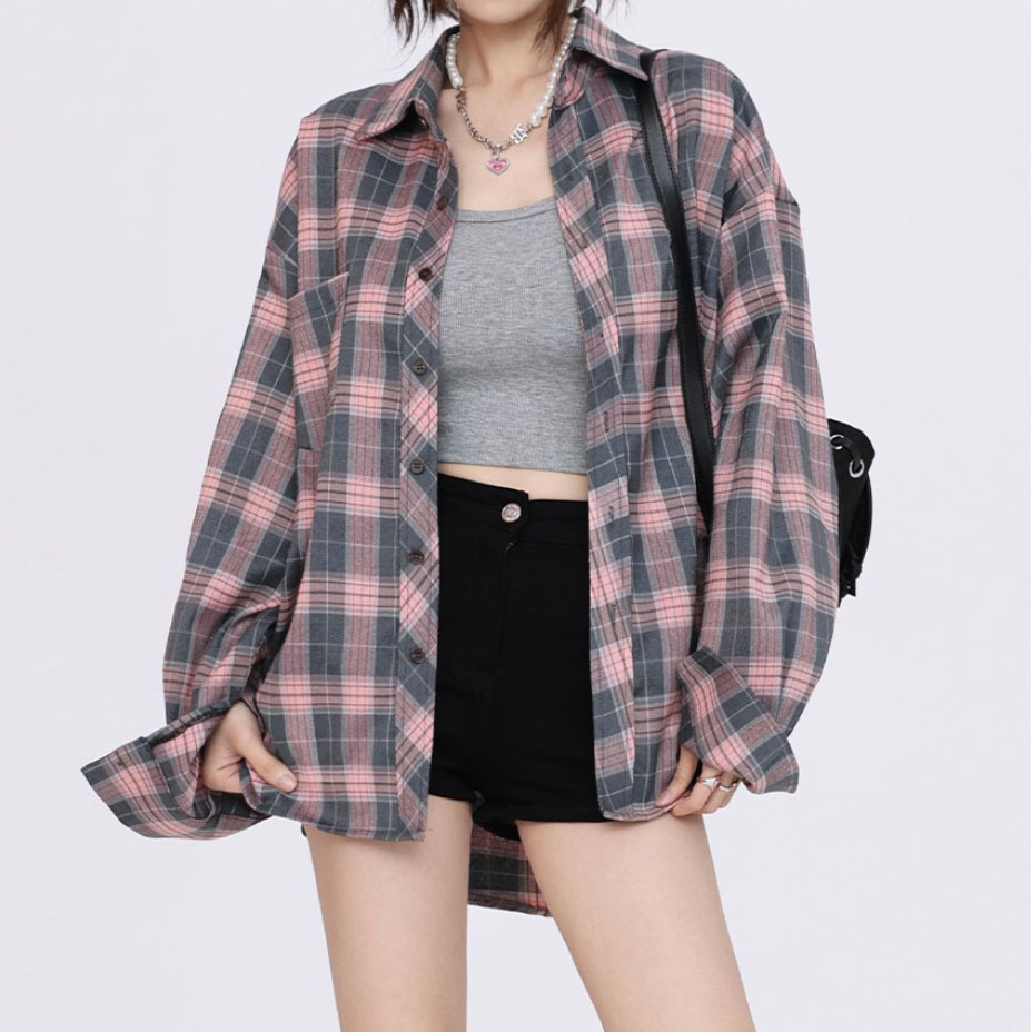甜辣美式复古格子衬衫外套女小个子宽松显瘦舒适百搭薄款长袖衬衣