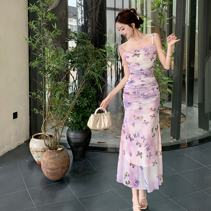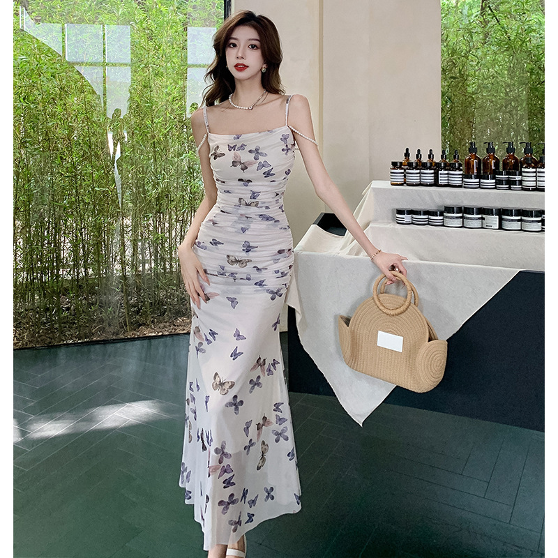 蝴蝶印花性感吊带连衣裙女收腰露背包臀鱼尾连衣裙设计感长裙夏潮