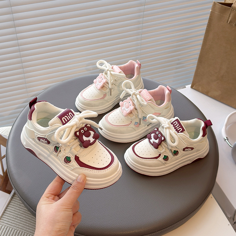 2025春款女童皮面板鞋便捷魔术贴草莓熊挂件可拆卸小白鞋简约款