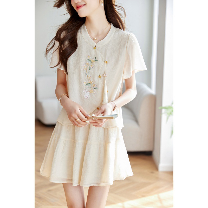 夏季新款重工绣花新中式国风时尚宽松套装女小个子衬衫短裙