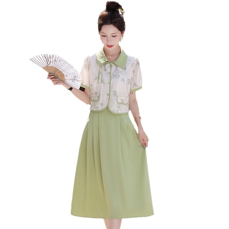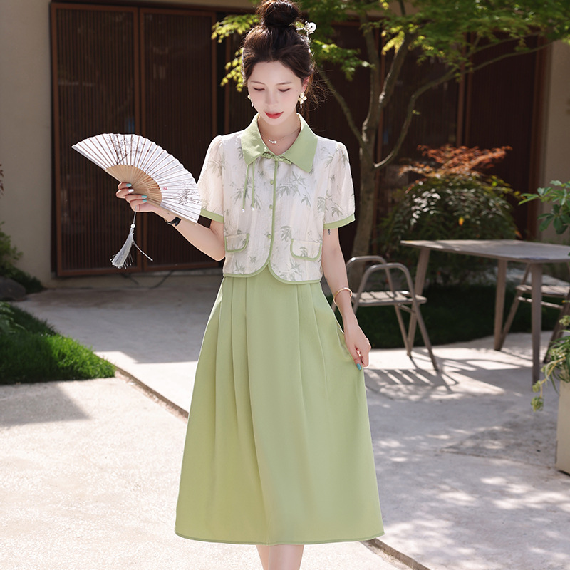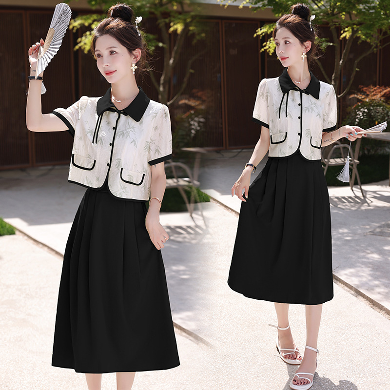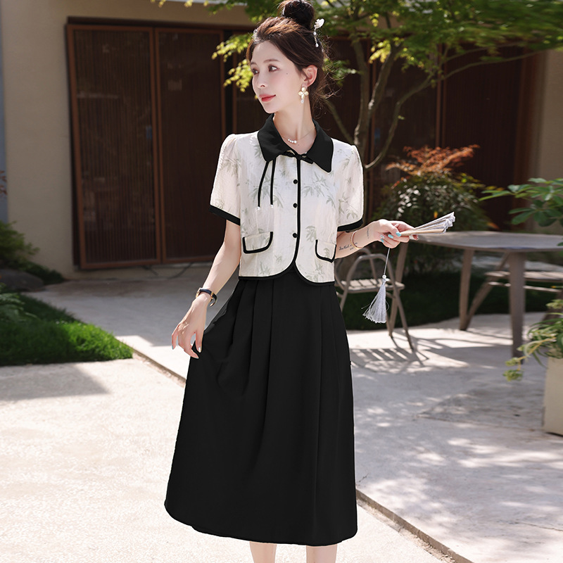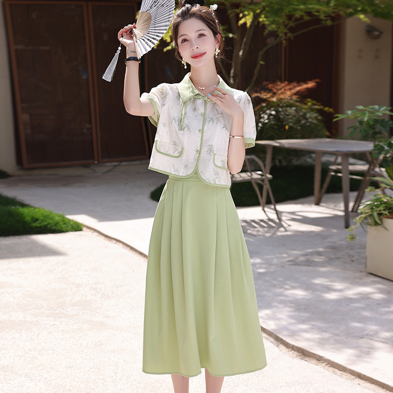 夏季新款国风盘扣小个子时尚衬衣半身裙两件套新中式套装女