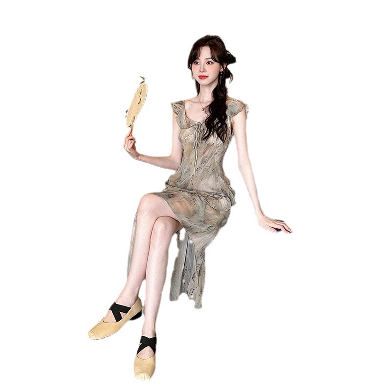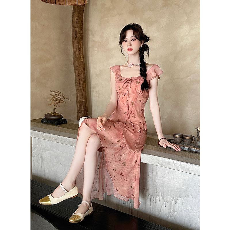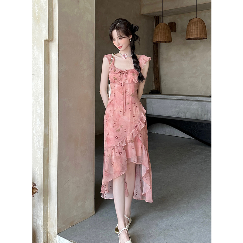 夏季新款法式设计感小众方领不规则时尚雪纺碎花中长款连衣裙