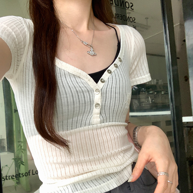 薄款微透正肩半排扣短袖T恤女夏季新款修身纯欲性感辣妹上衣
