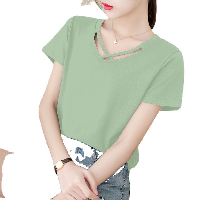 韩版休闲U领针织衫春夏新款百搭纯色减龄短袖上衣气质T恤女