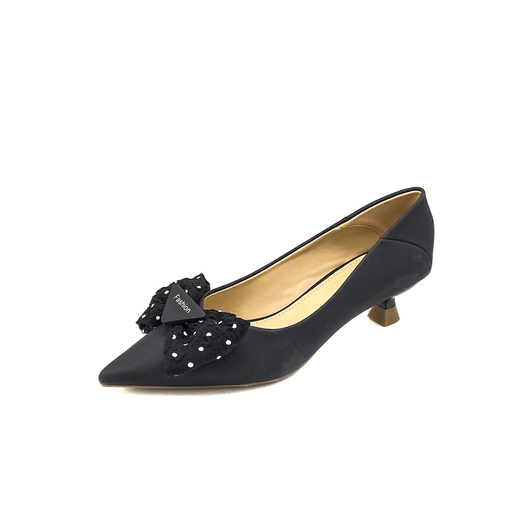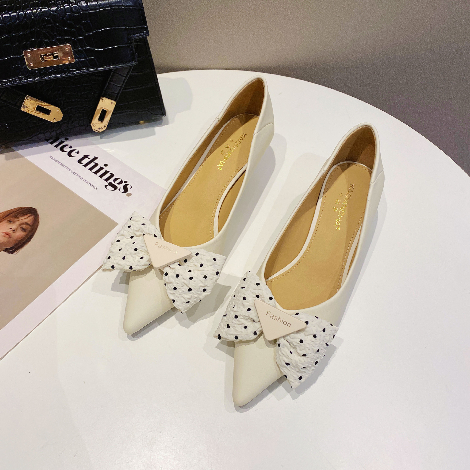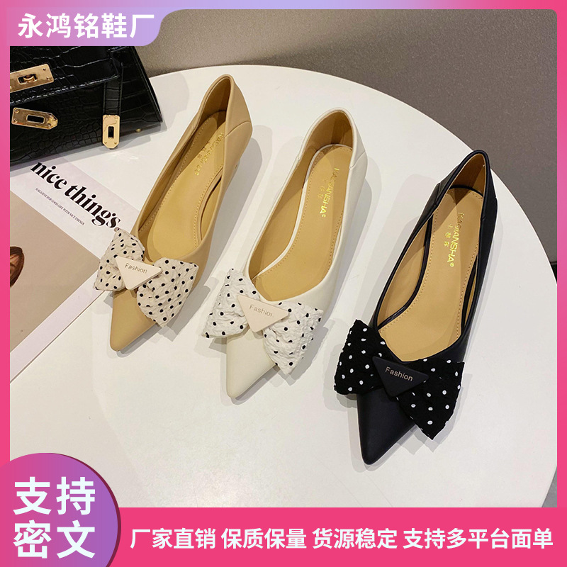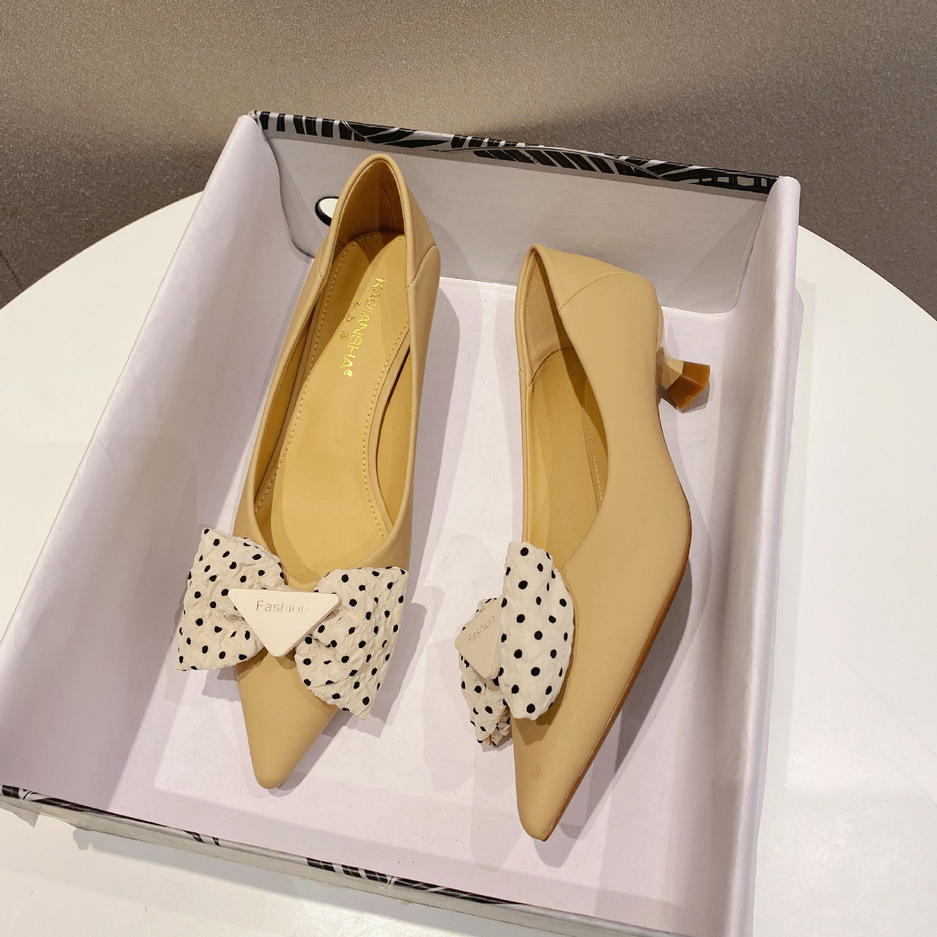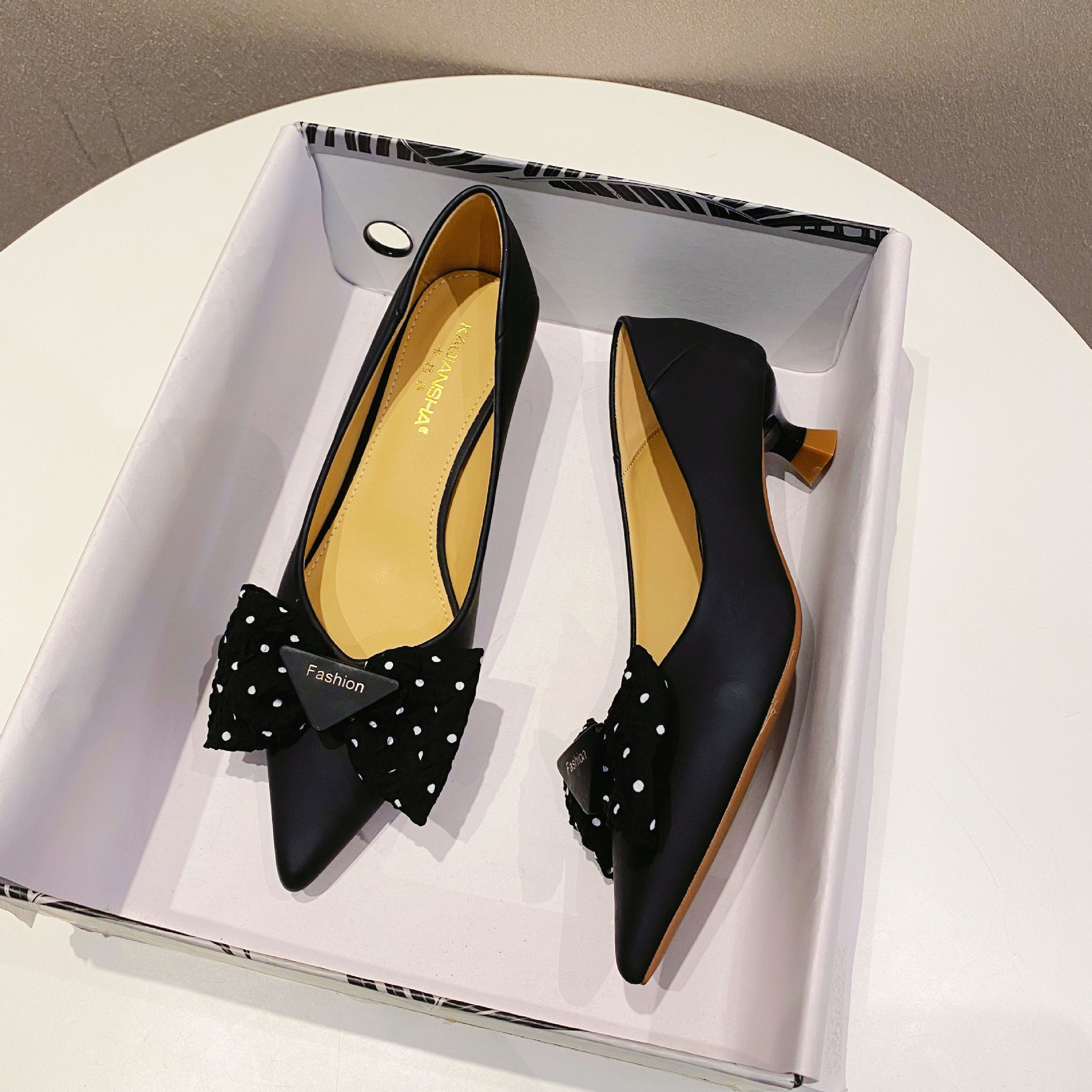羊皮韩系尖头蝴蝶结浅口高跟鞋女细跟新款秋款一脚蹬单鞋女