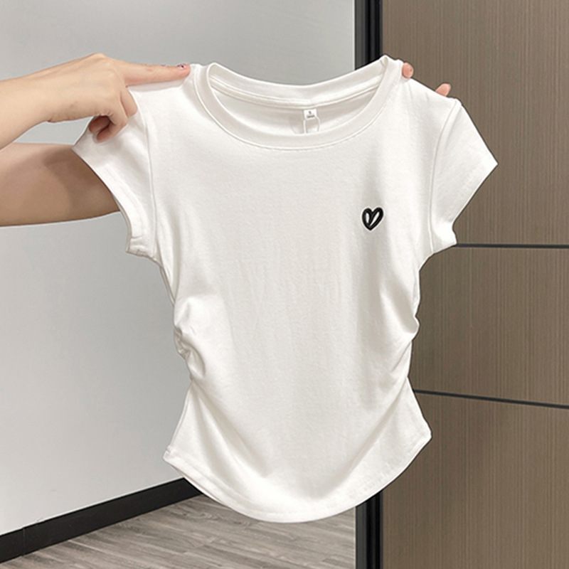 圆领正肩短袖T恤女修身短款设计感小众褶皱收腰上衣夏季新款