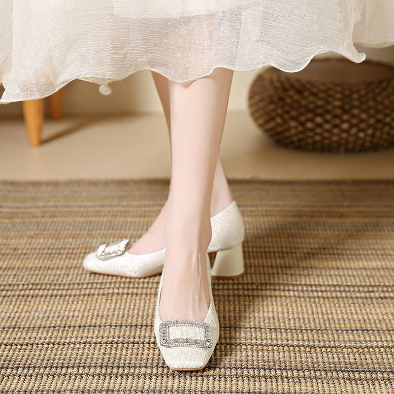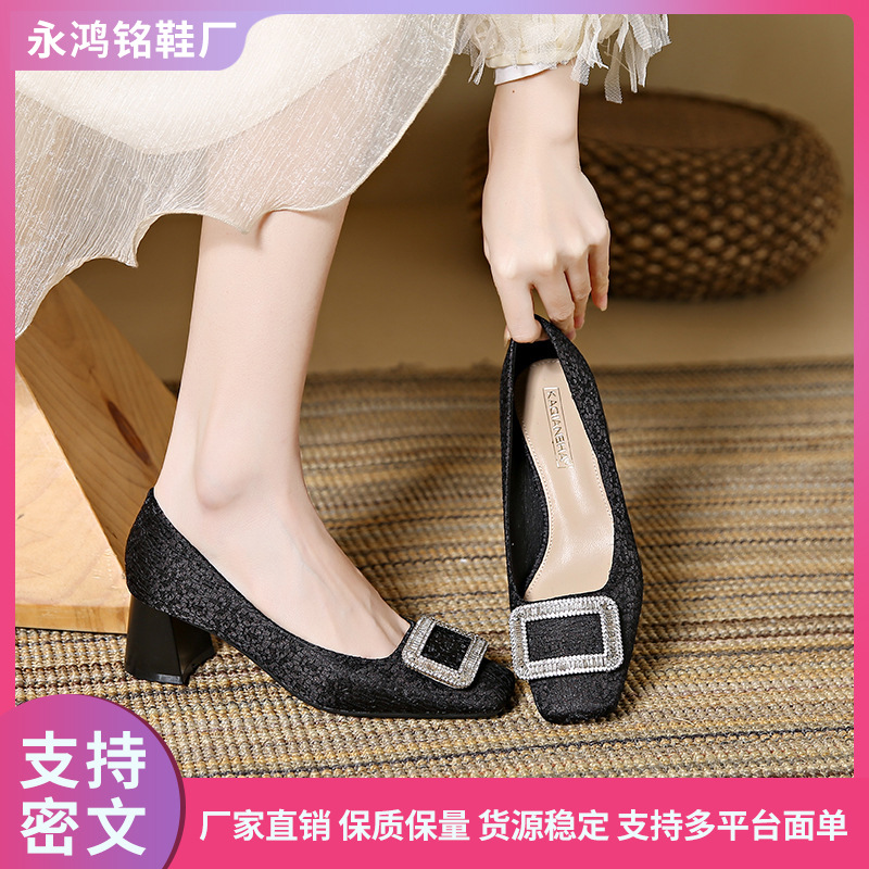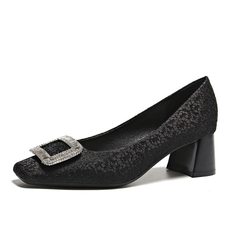 1390-11【羊皮】复古缎面方头单鞋女通勤百搭方扣粗跟浅口女鞋子