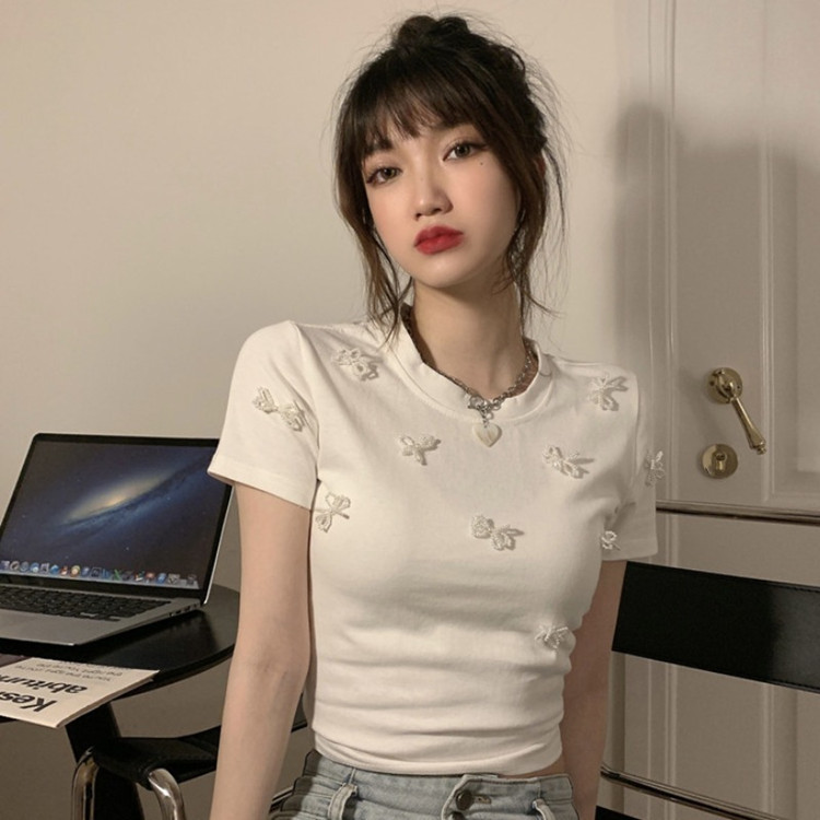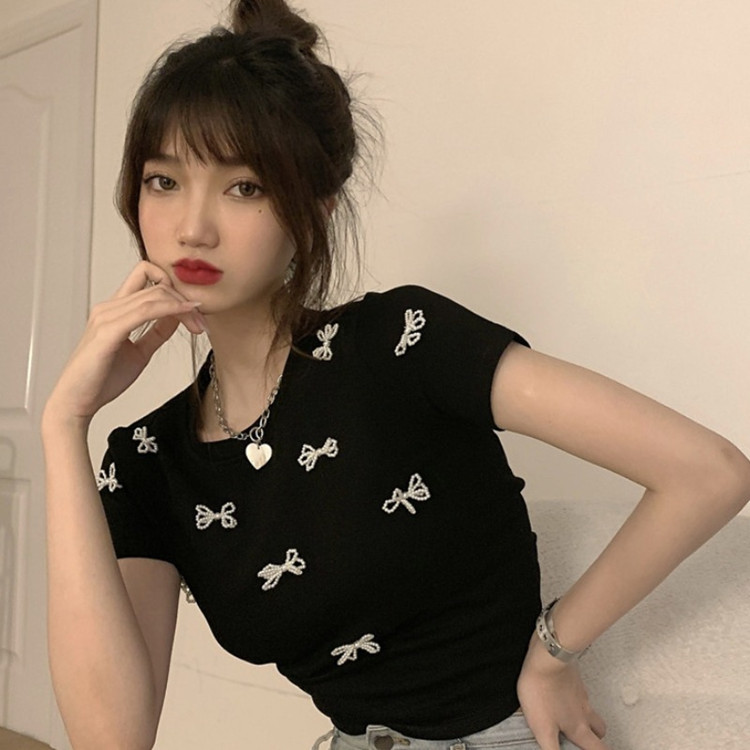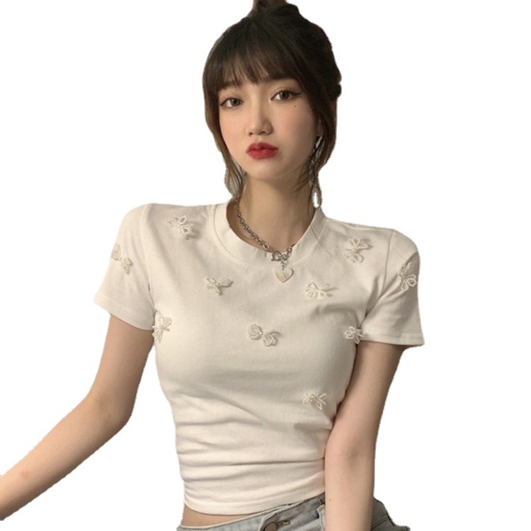 春夏季新款蝴蝶结钉珠高腰露脐短款上衣女潮ins设计感小众短袖t恤