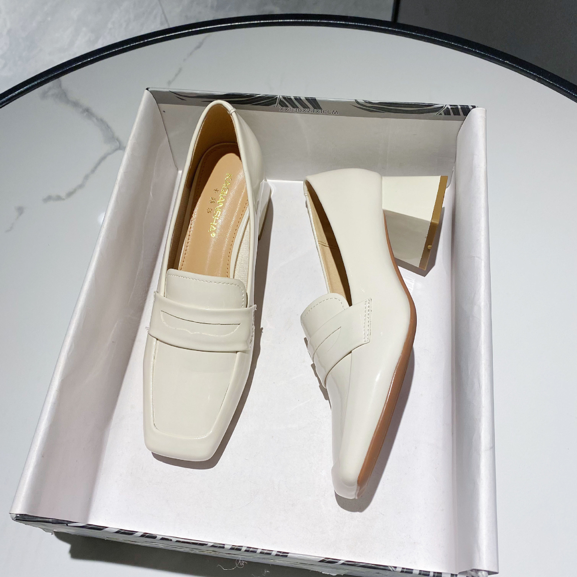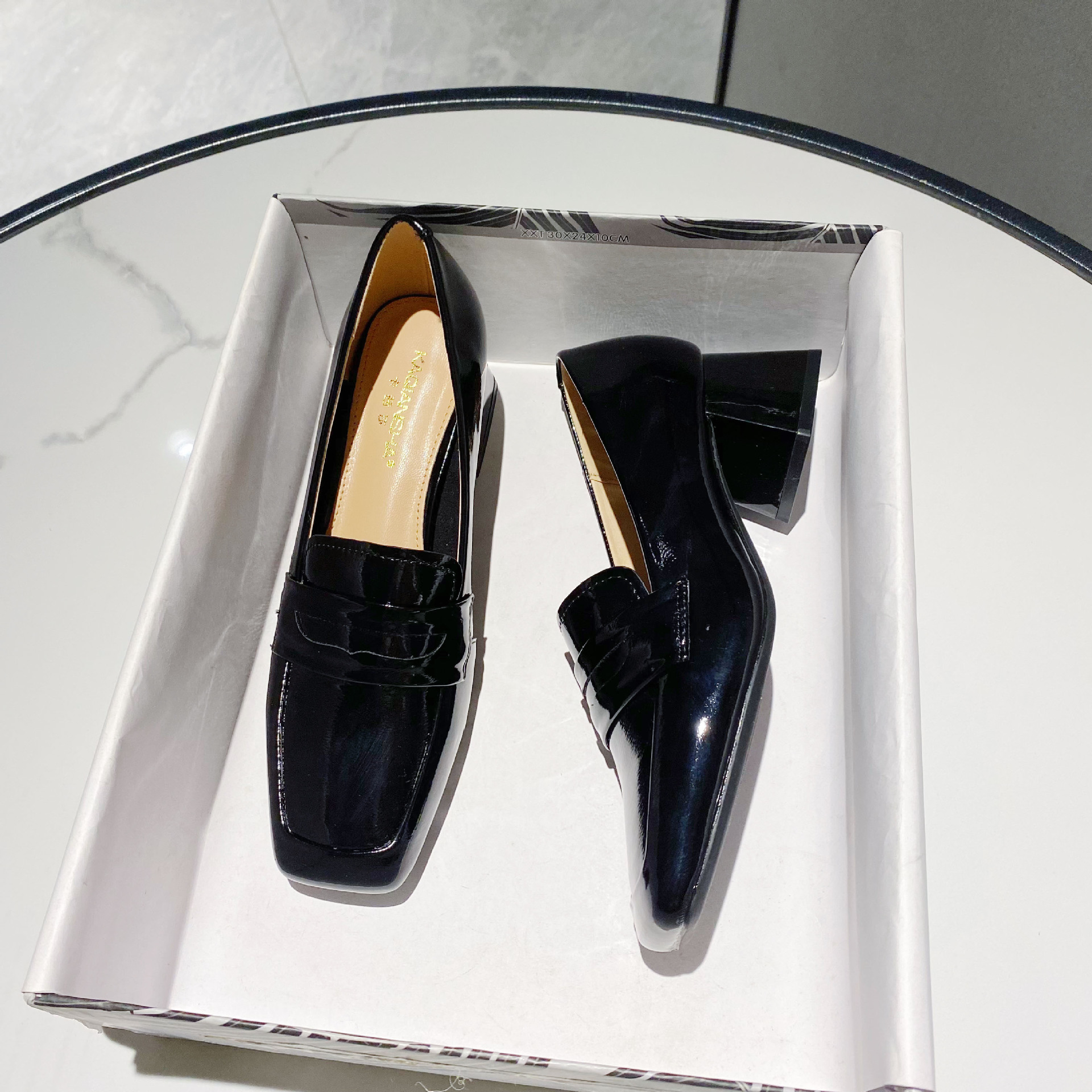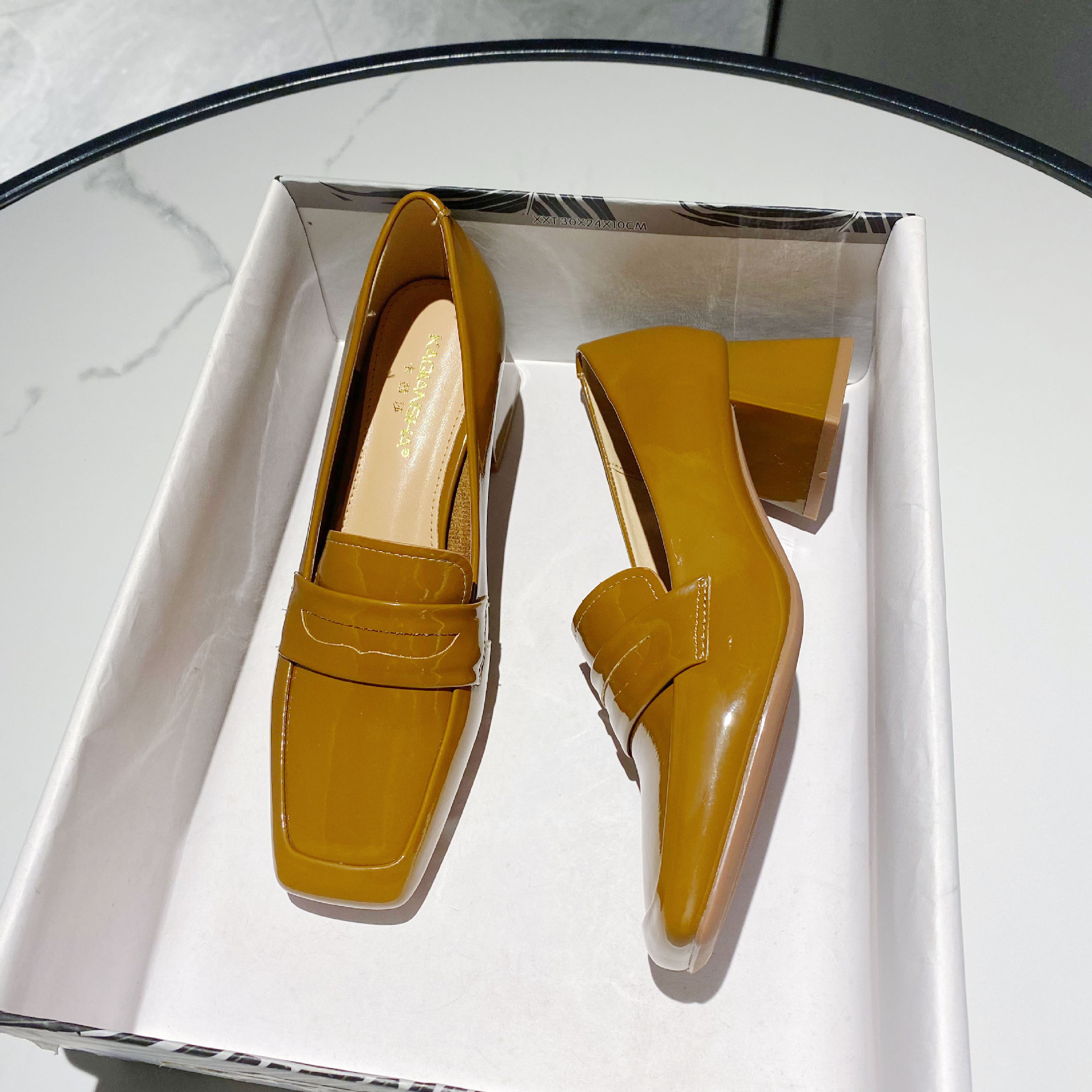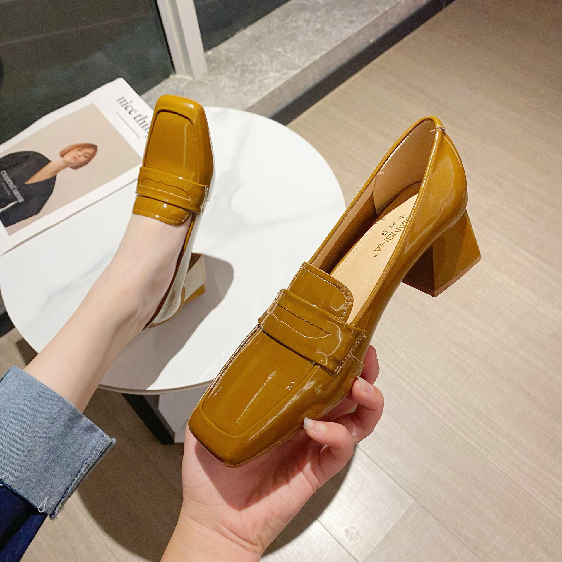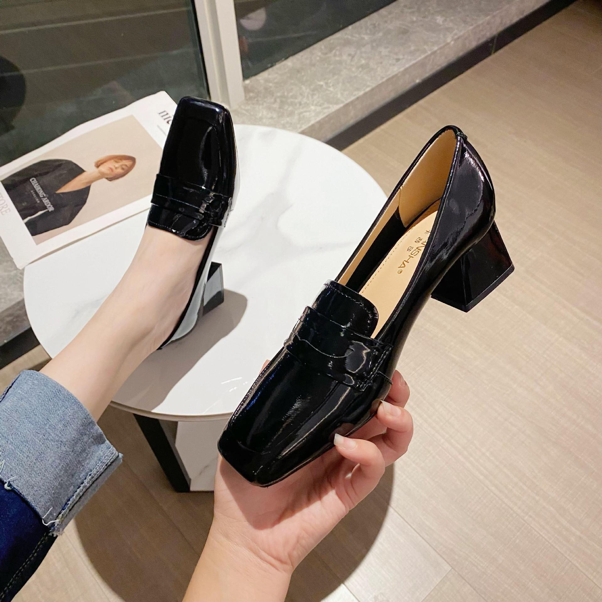 漆皮中跟方头单鞋女新款韩版纯色粗跟女鞋低帮浅口性感高跟鞋