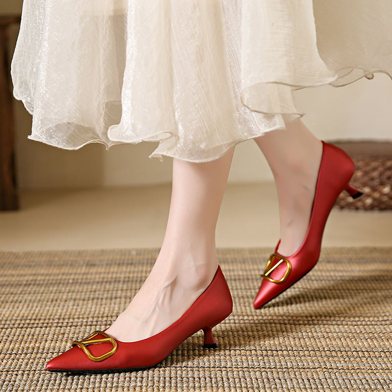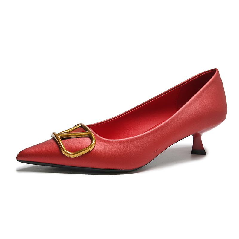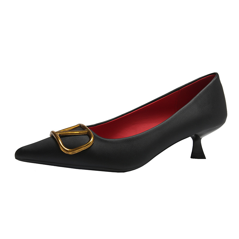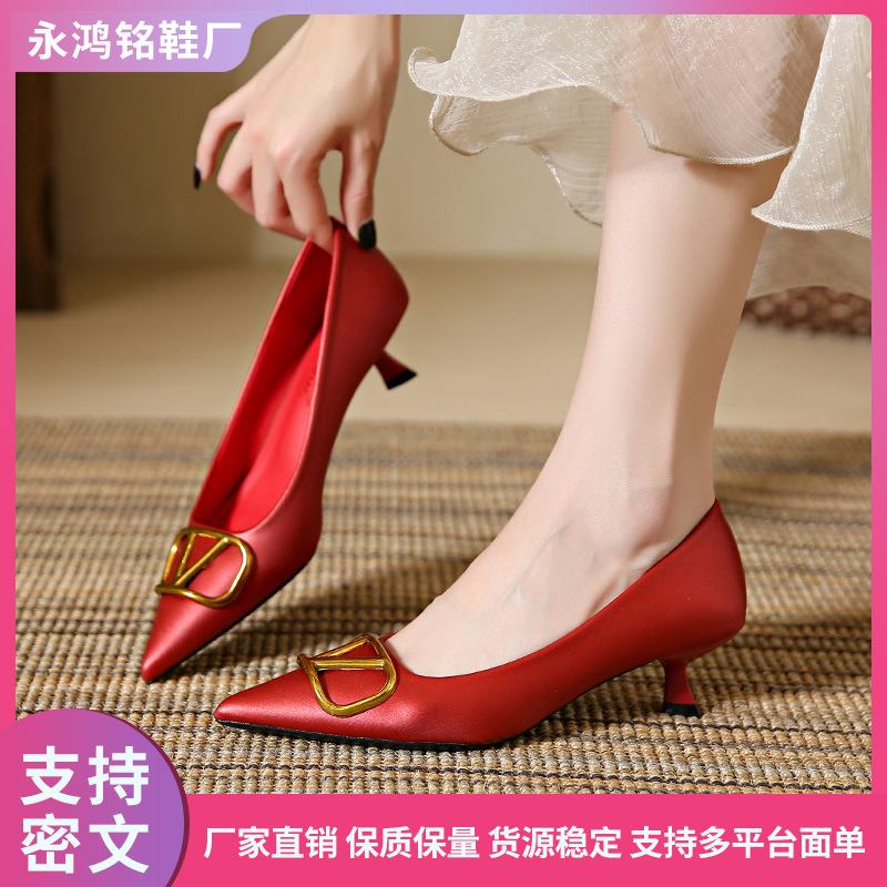 裸色尖头高跟鞋女细跟春夏新款金属V扣浅口百搭小矮跟单鞋