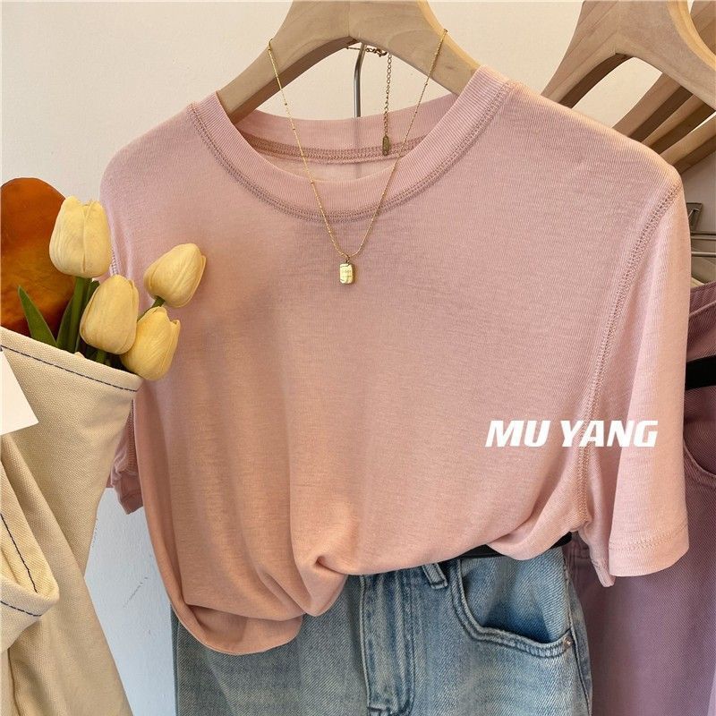 高品质重工纯色短袖T恤女夏韩版遮肉圆领套头打底设计感洋气上衣