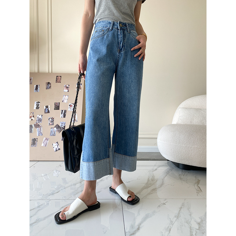 司南 时髦撞色卷边九分高腰直筒显瘦牛仔裤春新款 SN1384