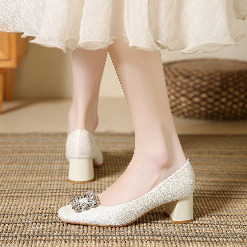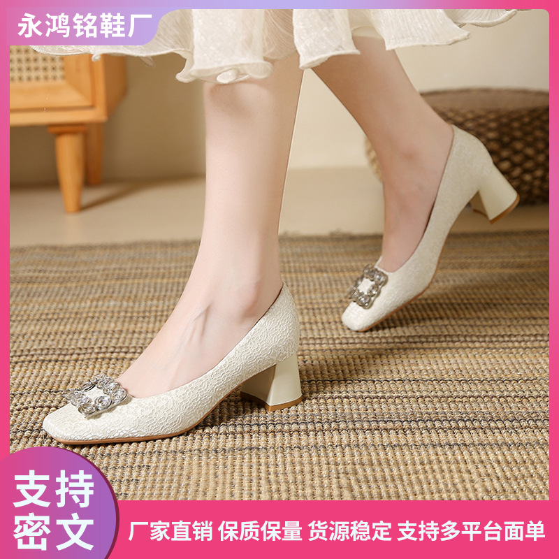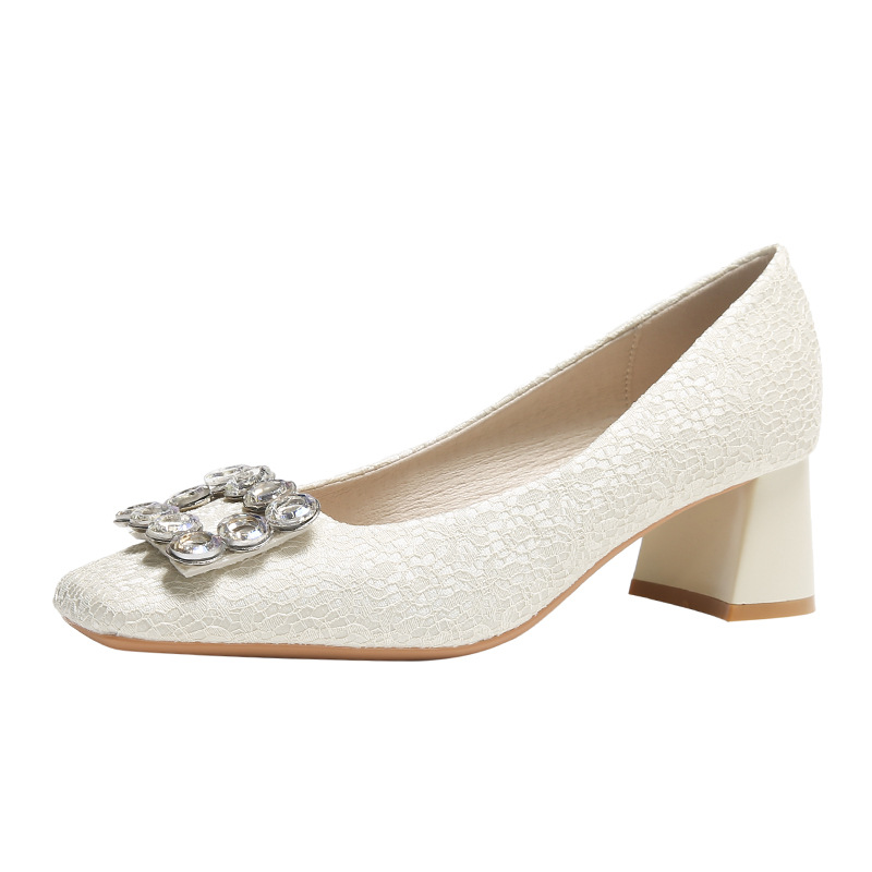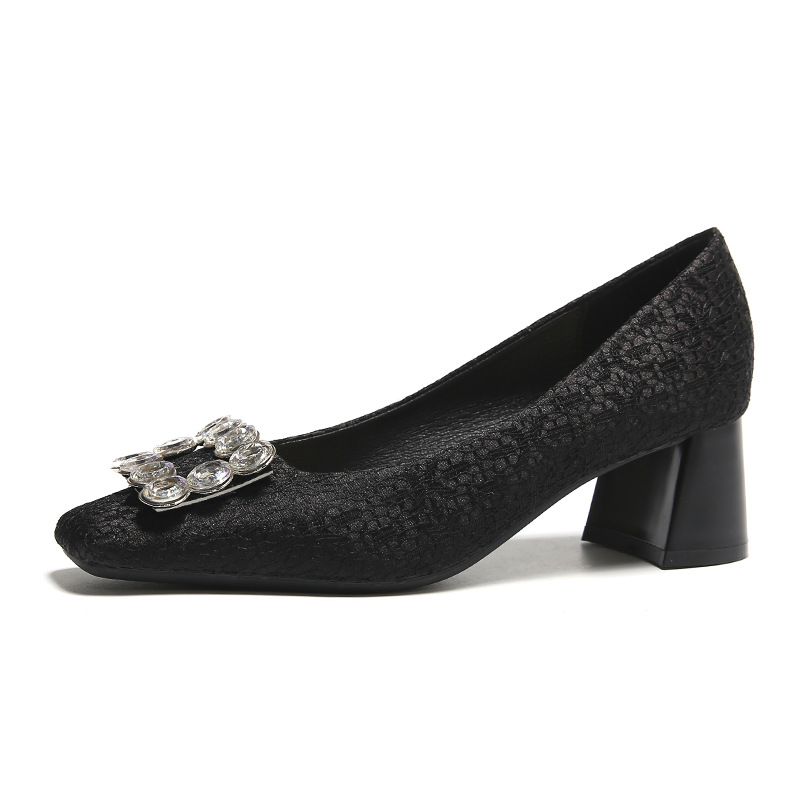 1390-10【羊皮】不累脚职业高跟鞋女粗跟年新款方头水钻单鞋