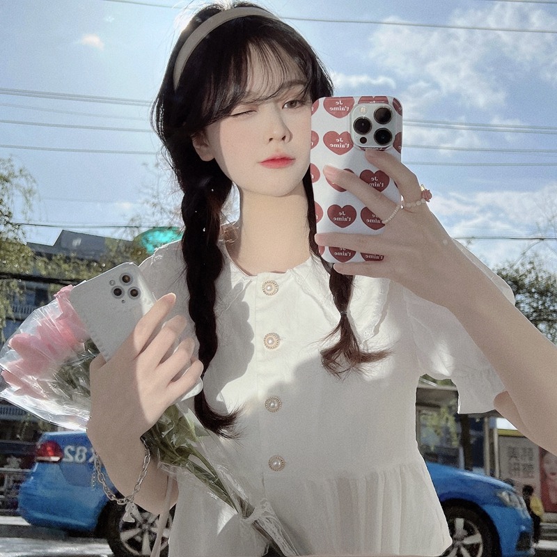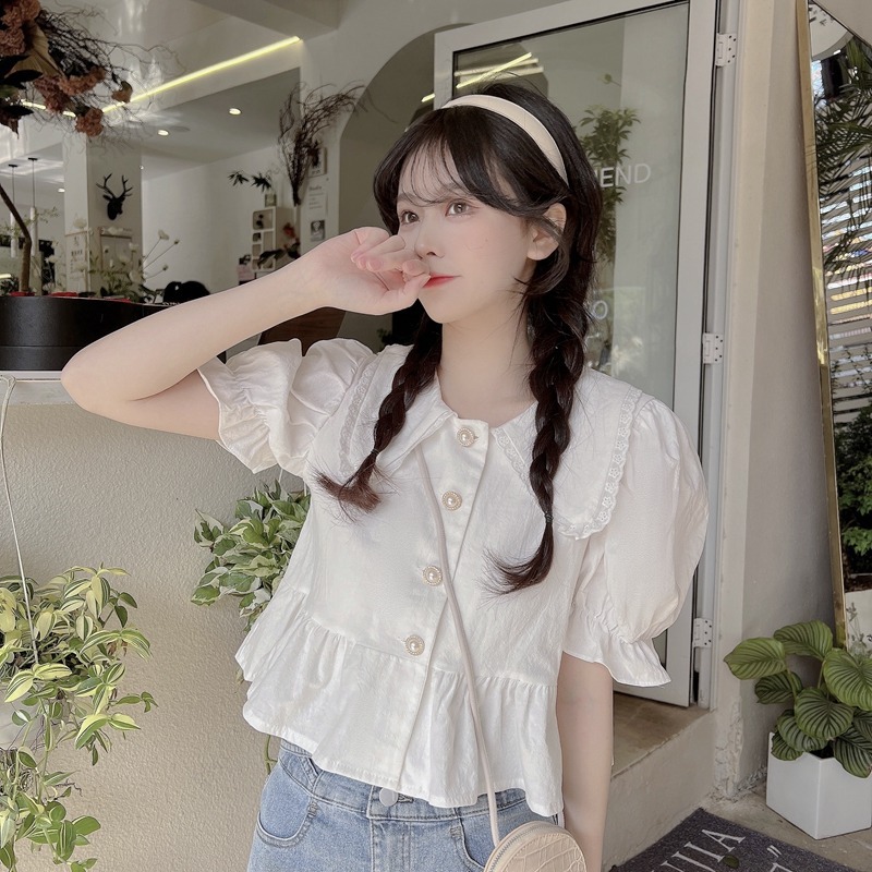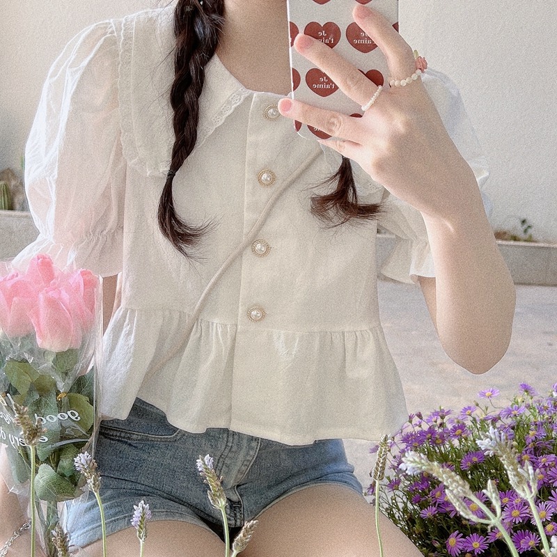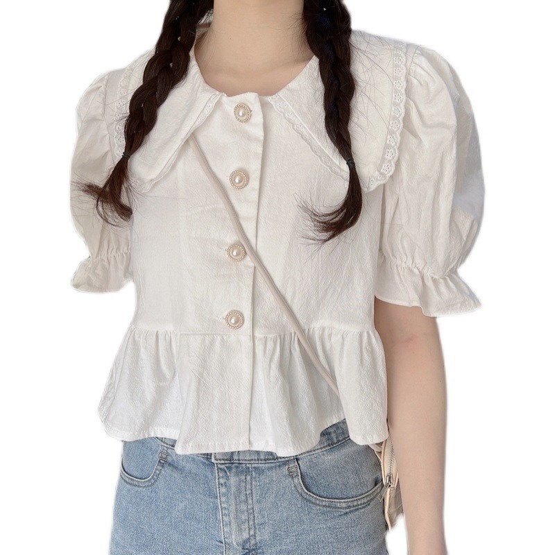 短袖衬衫设计感夏季港味chic短款别致上衣女泡泡袖娃娃领衬衣