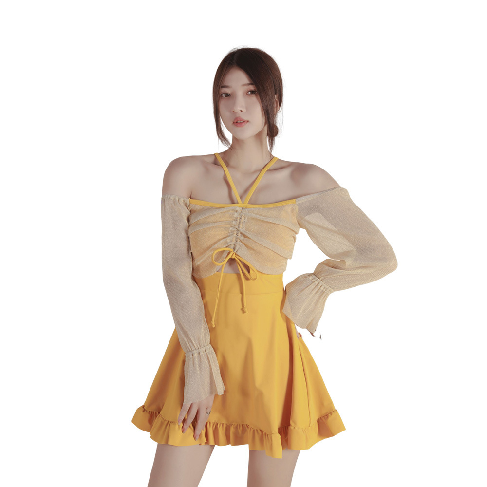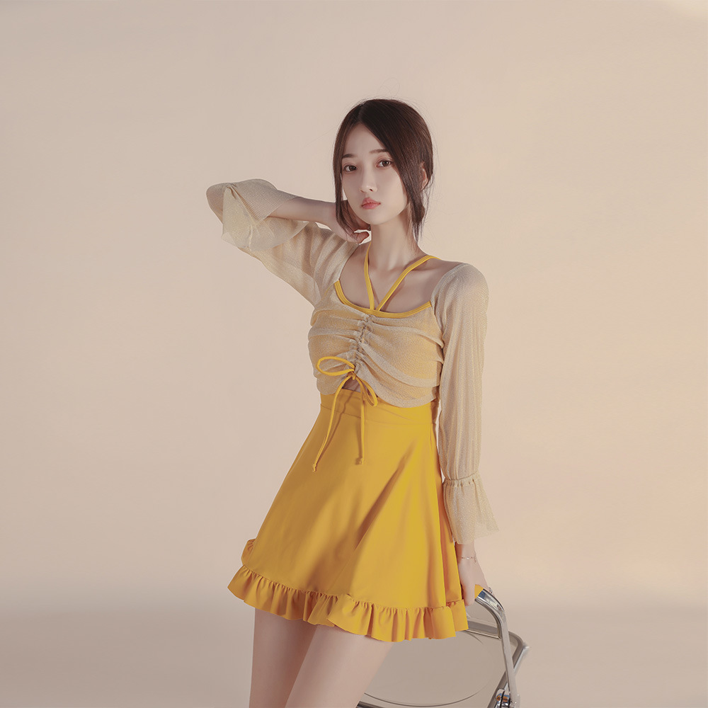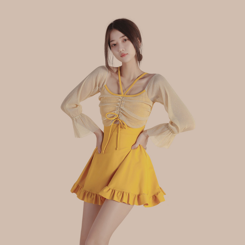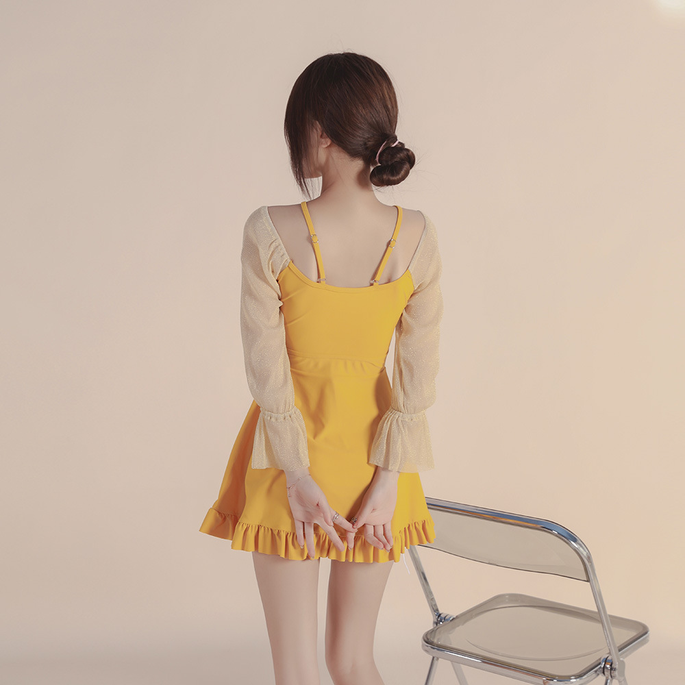 保守长袖连体泳衣女网纱防晒葫芦岛泳装韩版显瘦半裙温泉度假泳衣