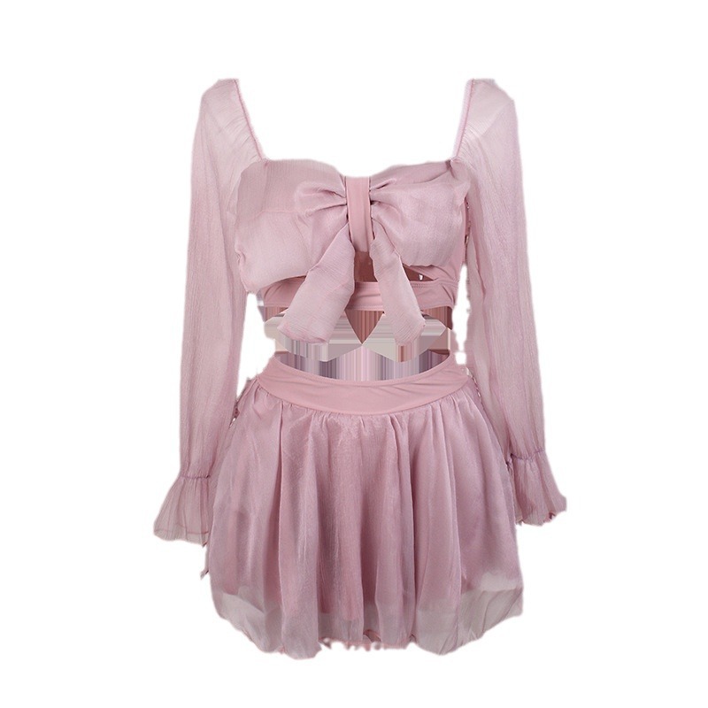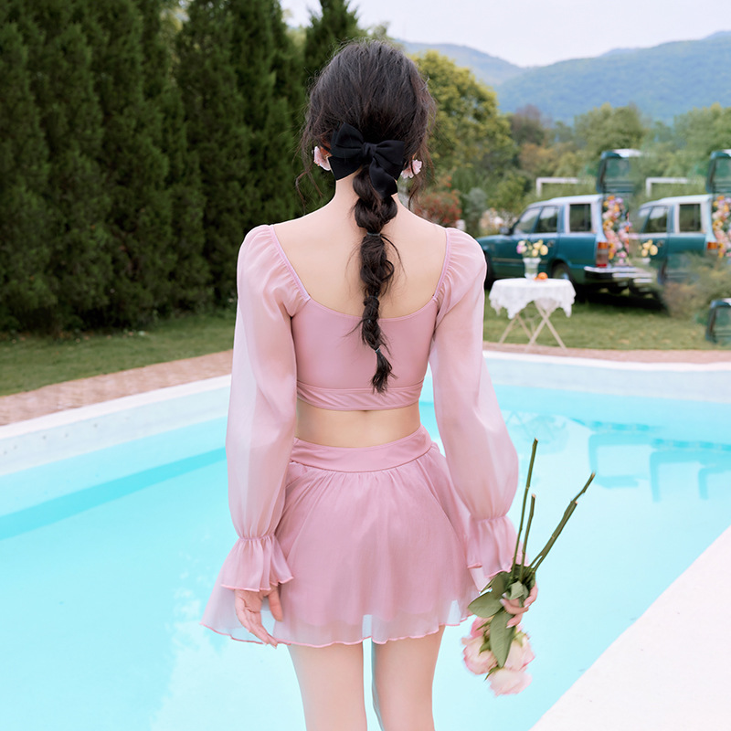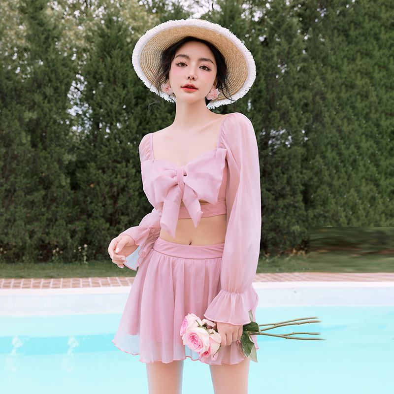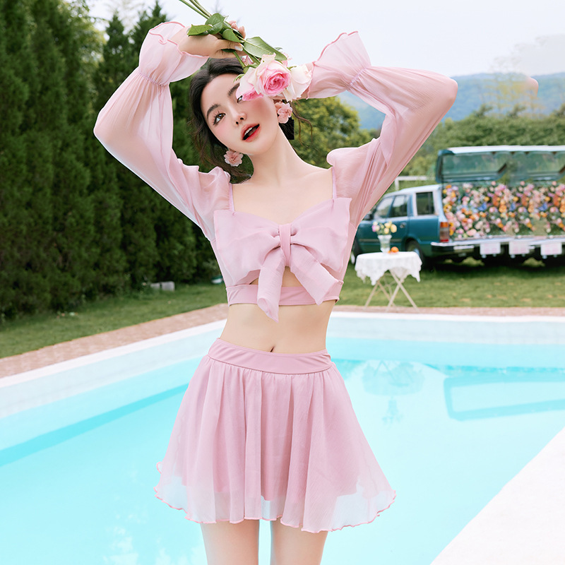 韩版小清新分体泳衣长袖防晒罩衫蝴蝶结款修身遮肉显瘦温泉女泳衣
