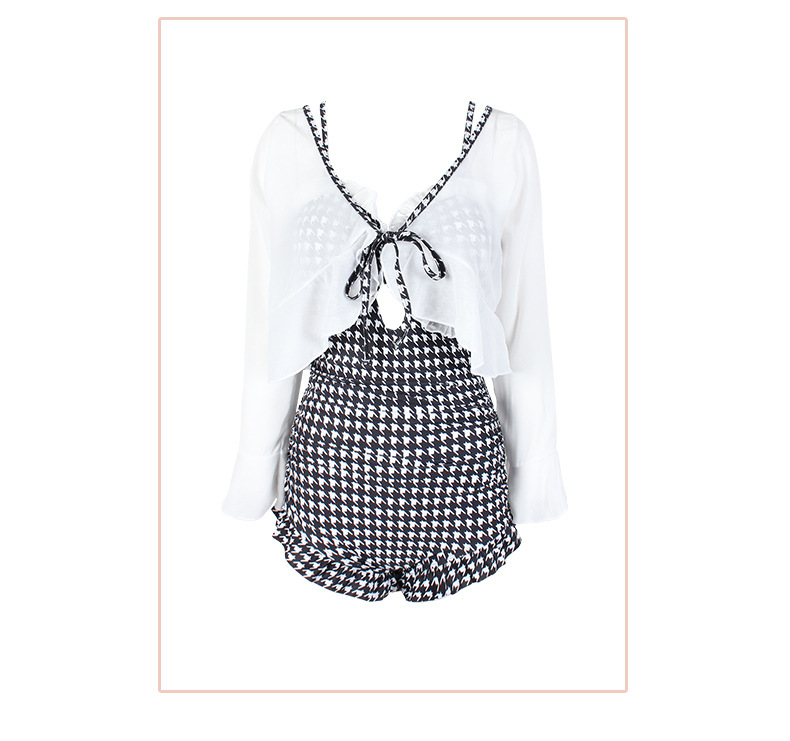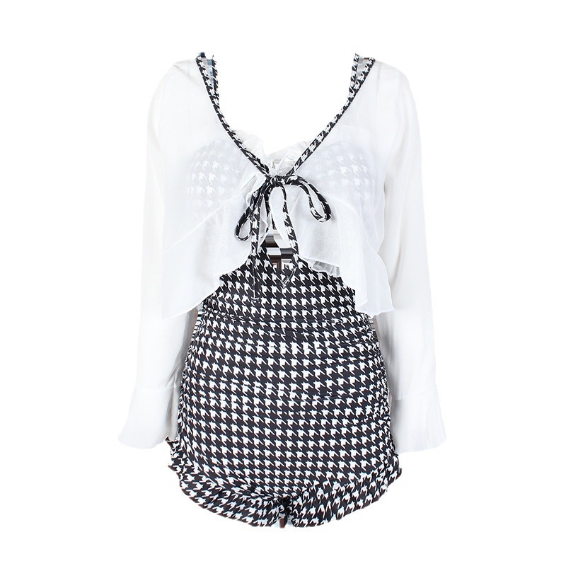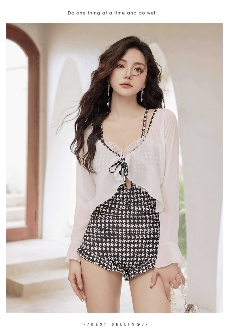 甜美复古风连体泳衣千鸟格图案泳衣修身显瘦防晒罩衫吊带裙式泳衣