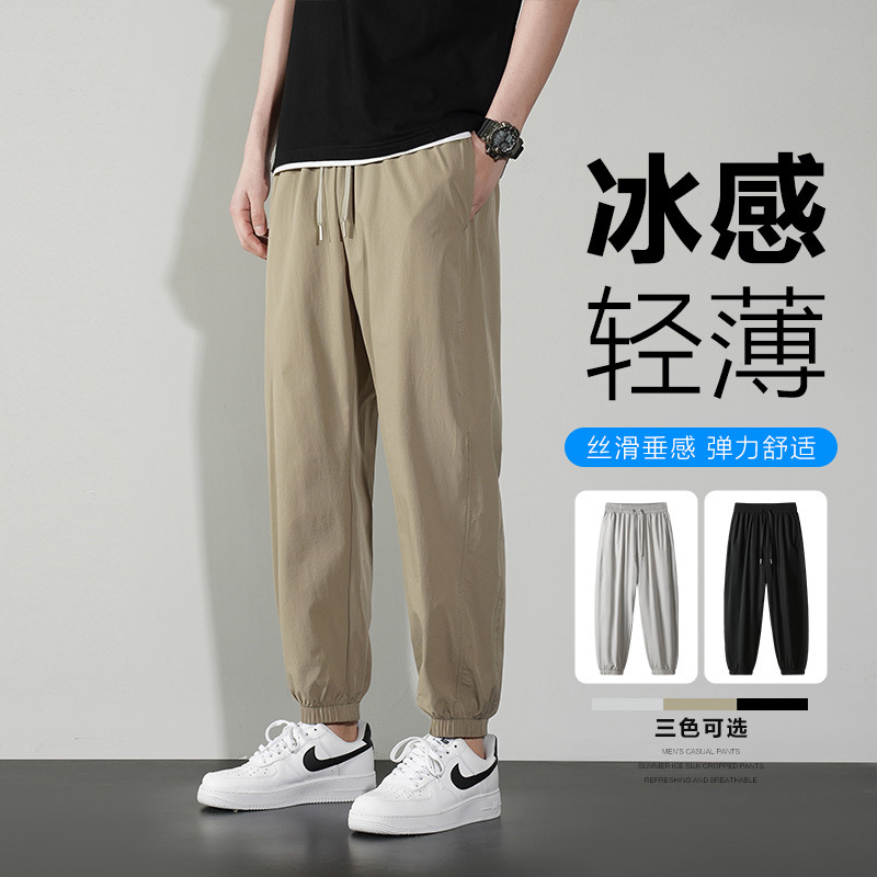 夏季男士宽松冰丝束脚长裤薄款时尚运动休闲裤舒适透气九分速干裤