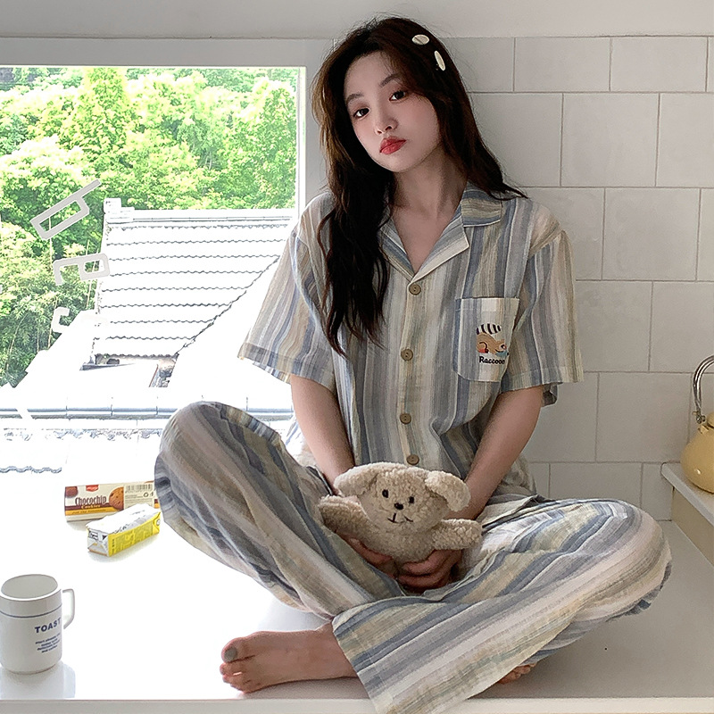 春夏季松鼠刺绣口袋条纹短袖长裤套装ins风清冷感家居服情侣睡衣