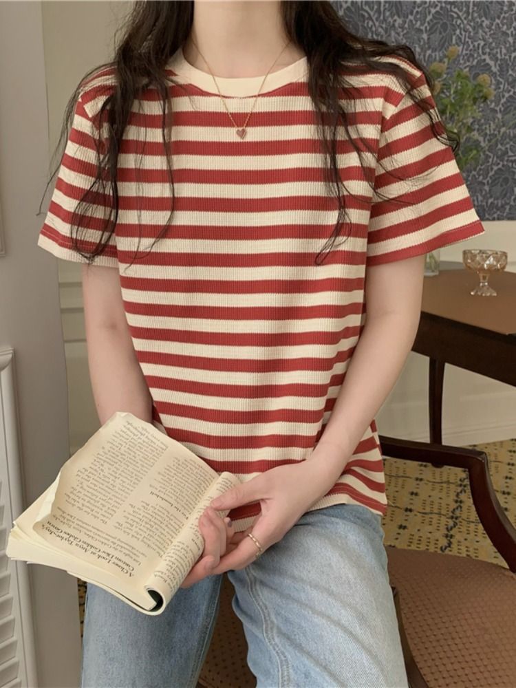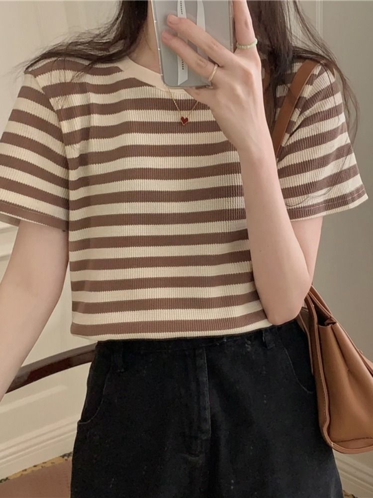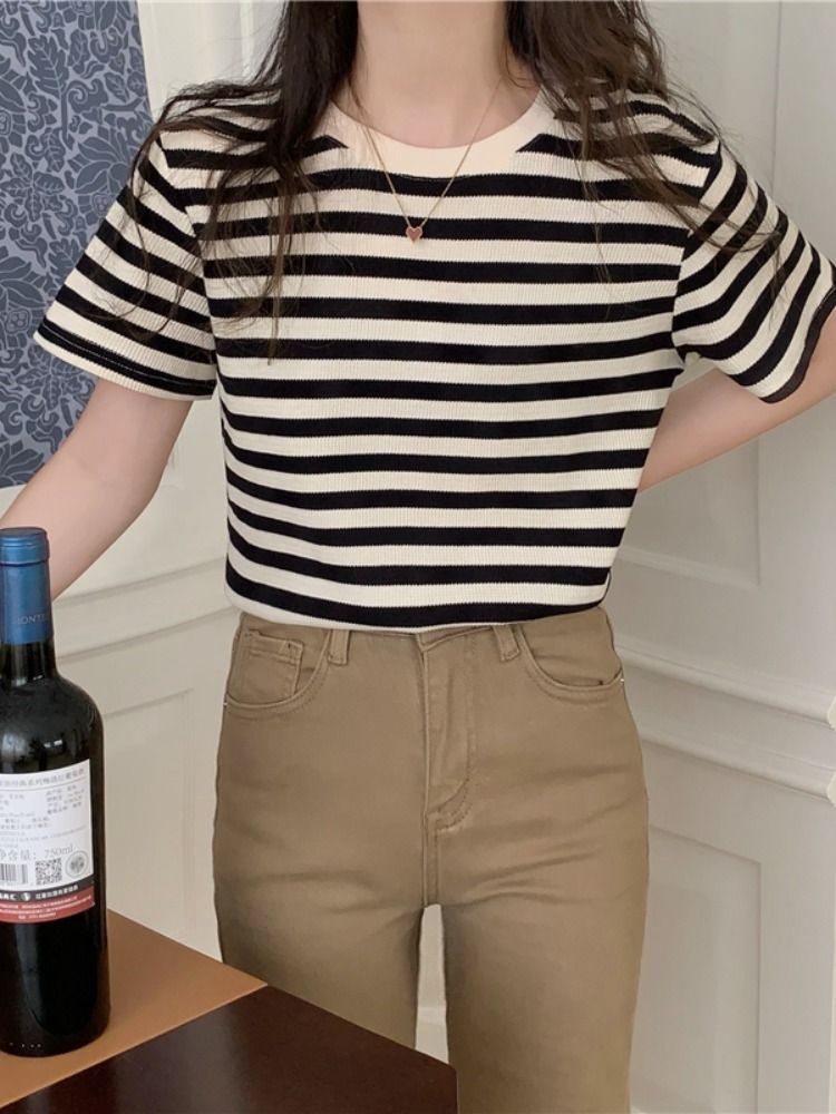 圆领条纹短袖t恤女夏季年新款韩版打底衫设计感小众宽松上衣