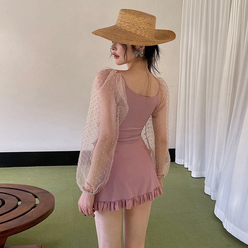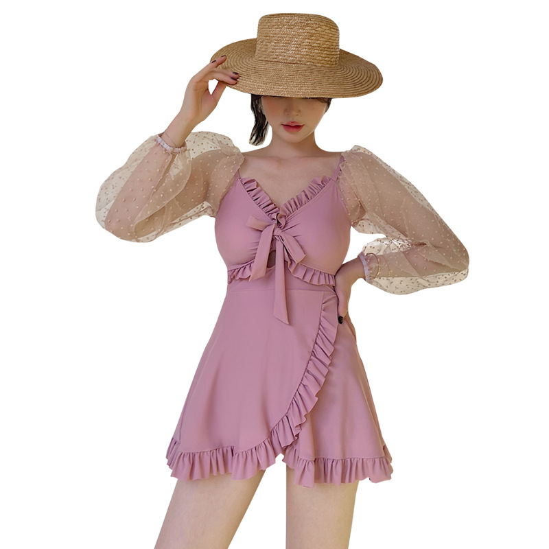 新款泳衣女性感纯欲纯色长袖防晒清新可爱遮肚显瘦沙滩泳装