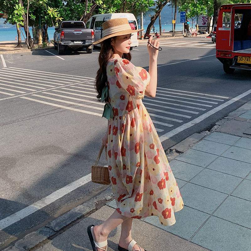 法式设计感小众花色短袖碎花连衣裙女春季绝美显瘦印花度假长裙子
