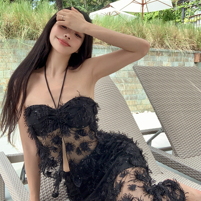 新款热销泳衣女高级纯色性感分体比基尼纯欲挂脖抹胸沙滩泳装