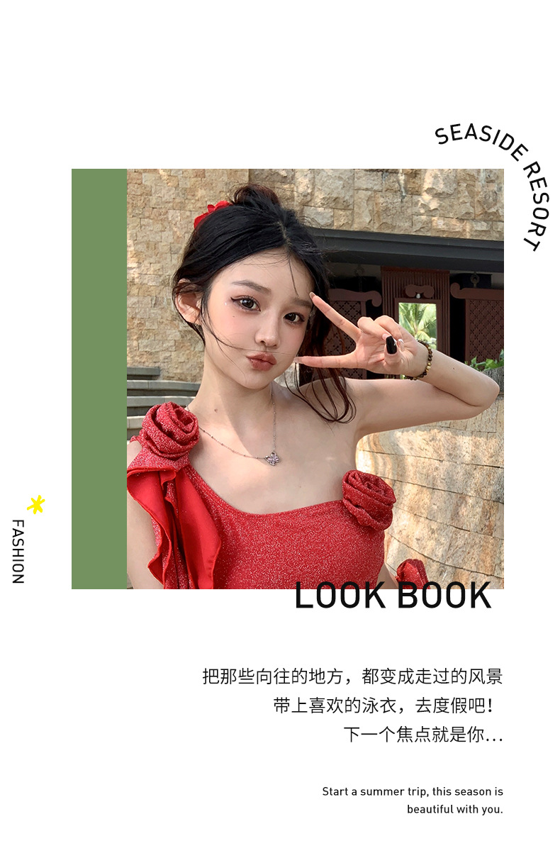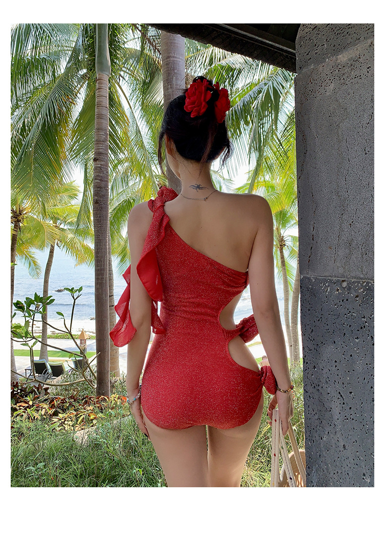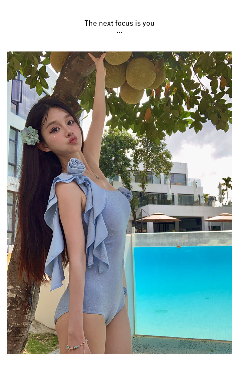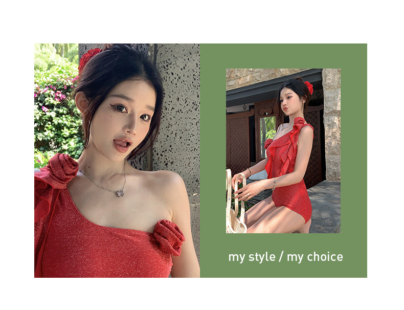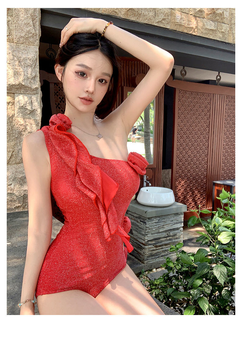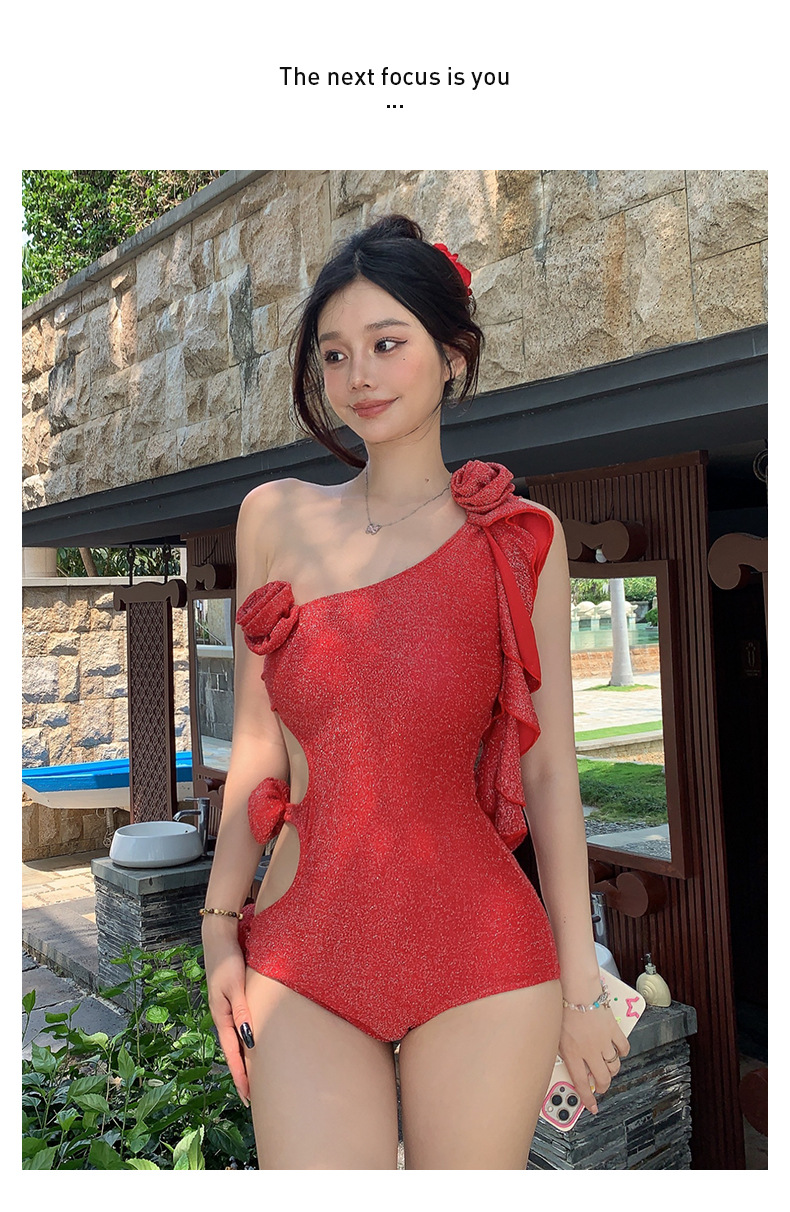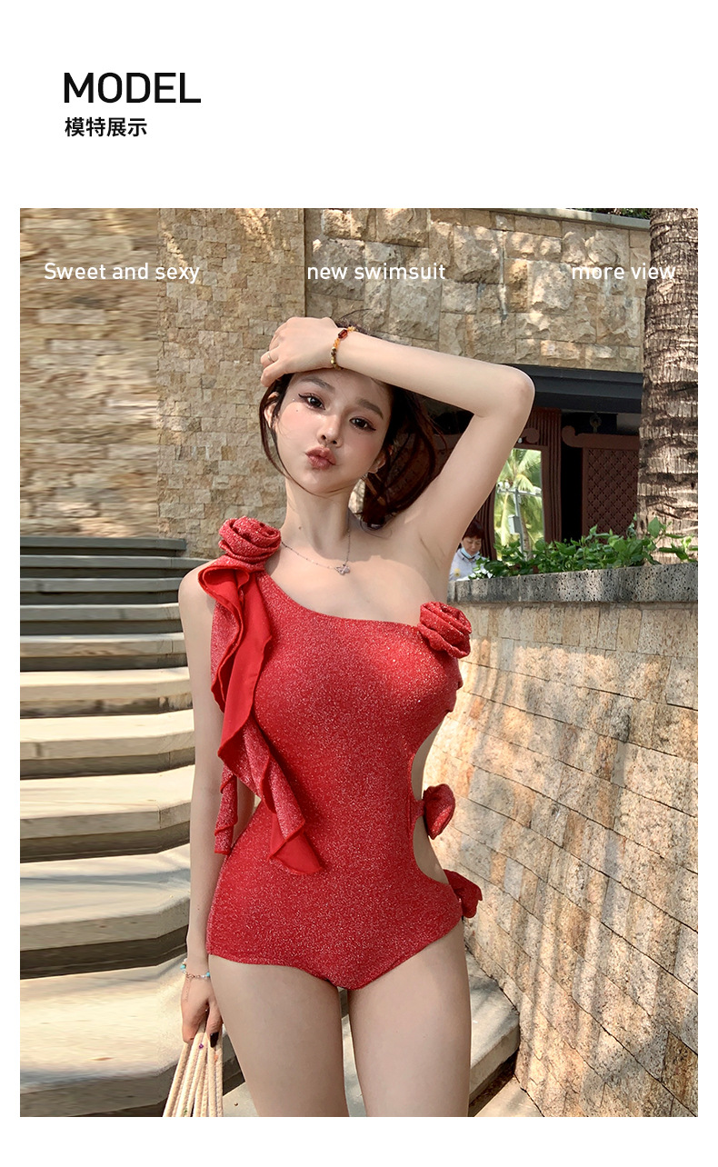 新款泳衣女高级纯色性感单肩漏腰立体花朵连体遮肚显瘦沙滩泳装