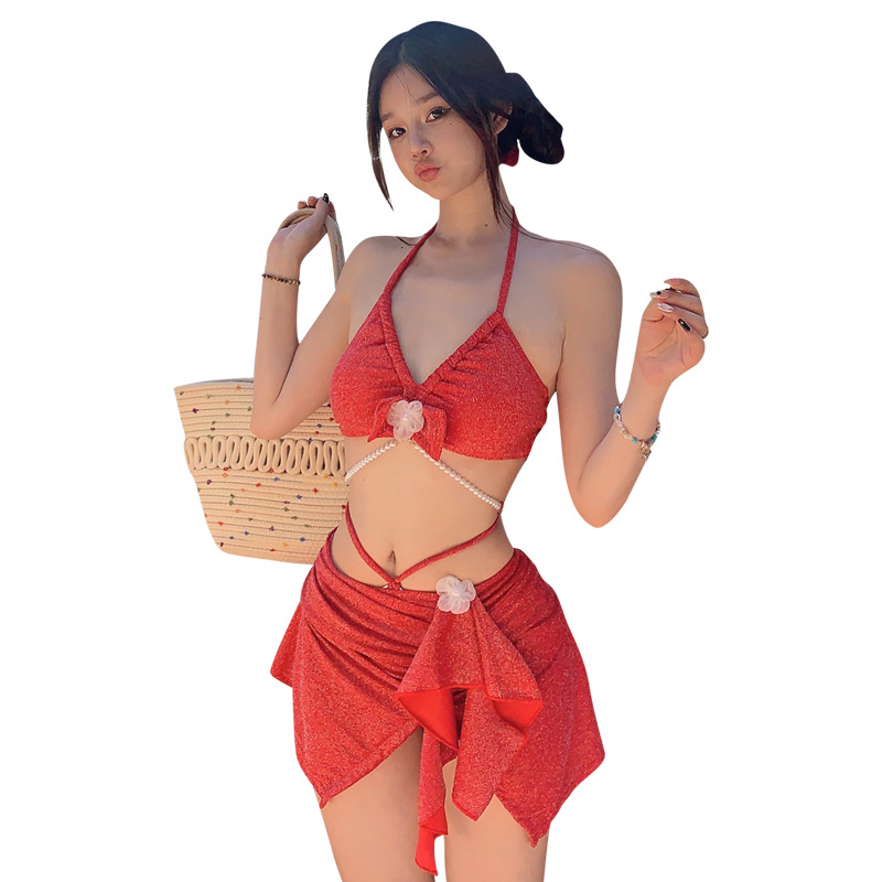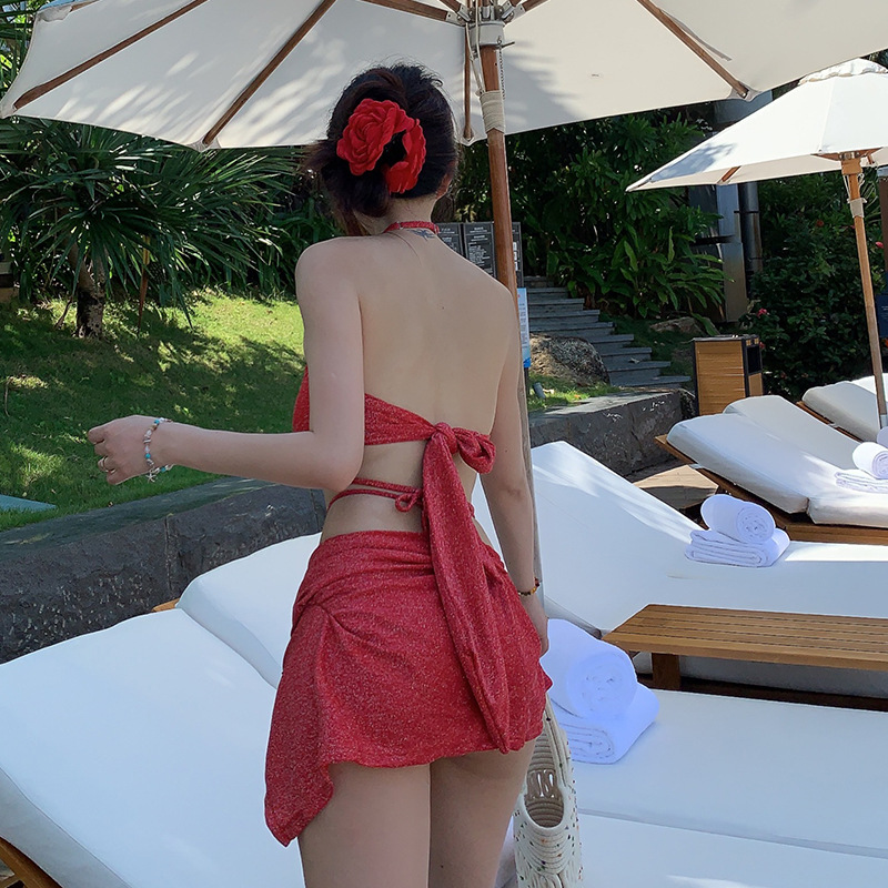 新款热销泳衣女性感纯色辣妹比基尼纯欲挂脖美背分体三件沙滩泳装
