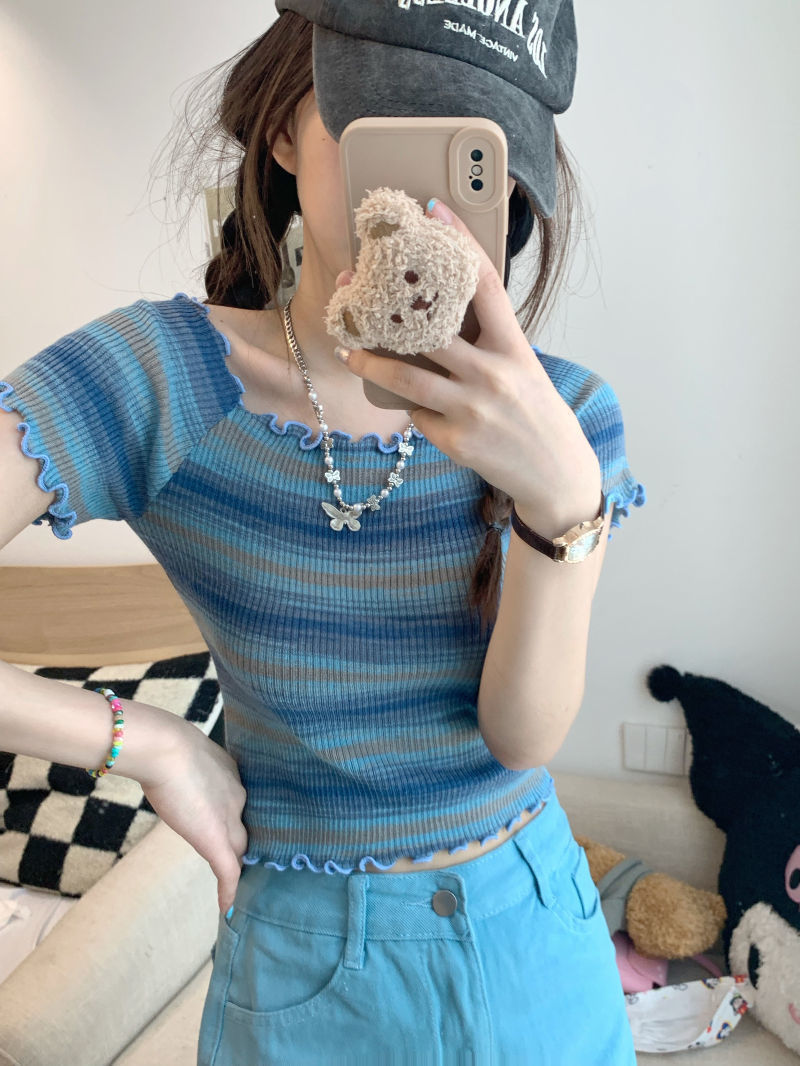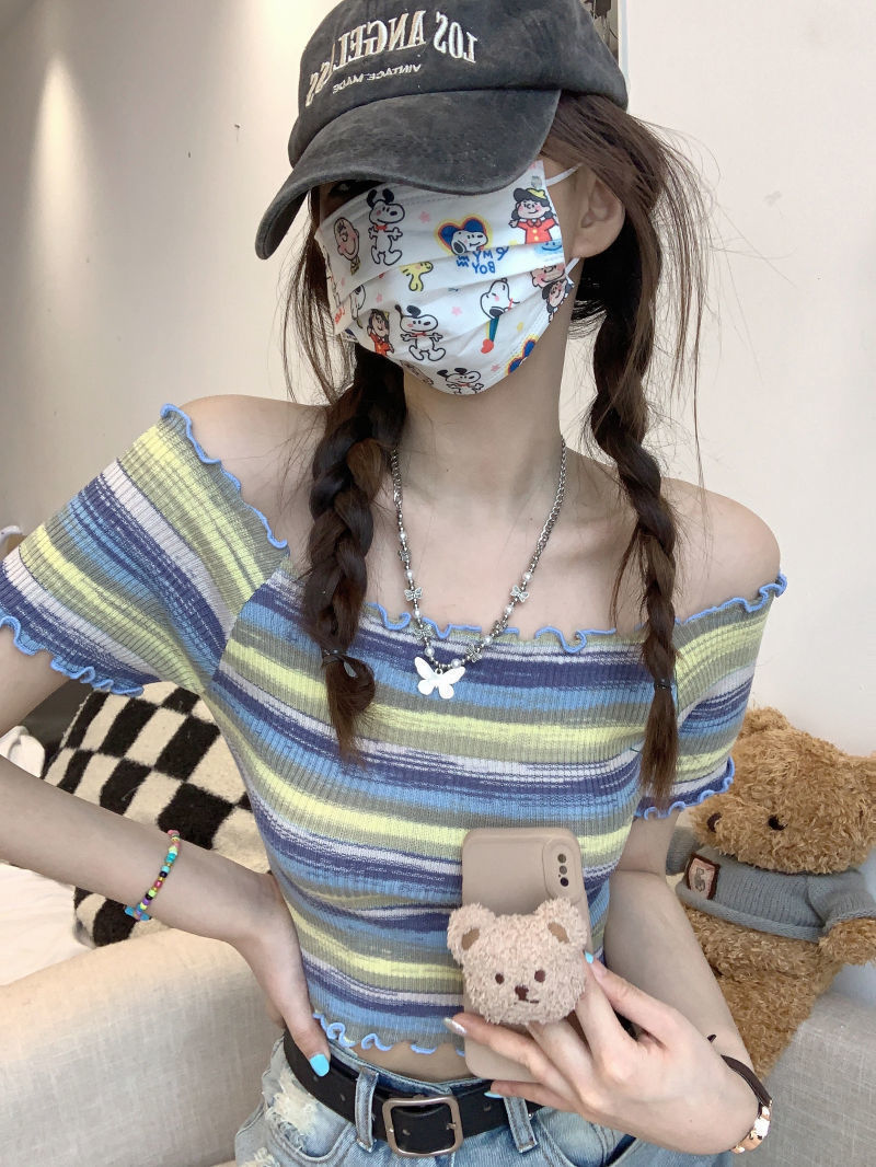 辣妹一字肩短款木耳边夏季chic内搭短袖t恤上衣女打底衫条纹小衫