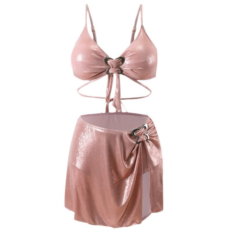 热销新款泳衣女性感纯色亮面分体三件套纯欲聚拢遮肚显瘦沙滩泳装