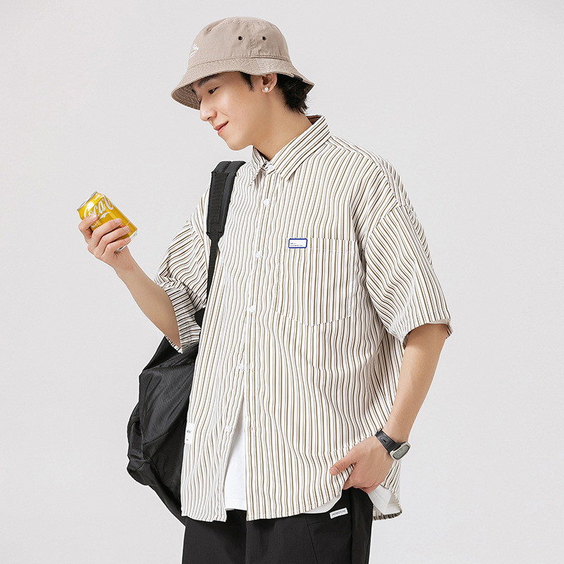 日系小众条纹短袖衬衫男生夏季新款翻领宽松休闲工装外套男士衬衣