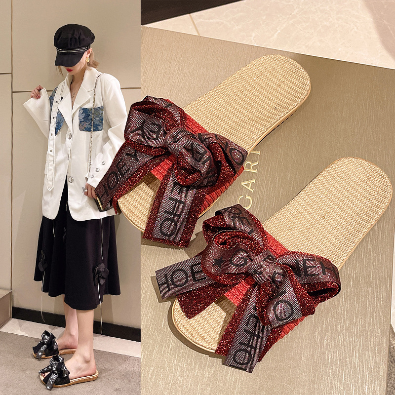 温柔日系大蝴蝶结亚麻拖鞋 防滑透气软底拖鞋 外穿时尚百搭一字拖