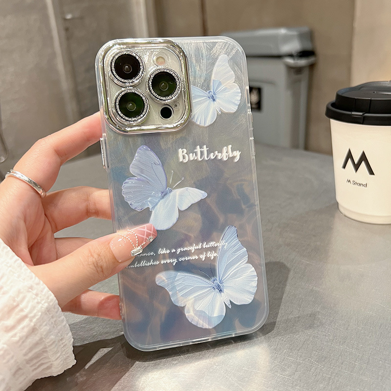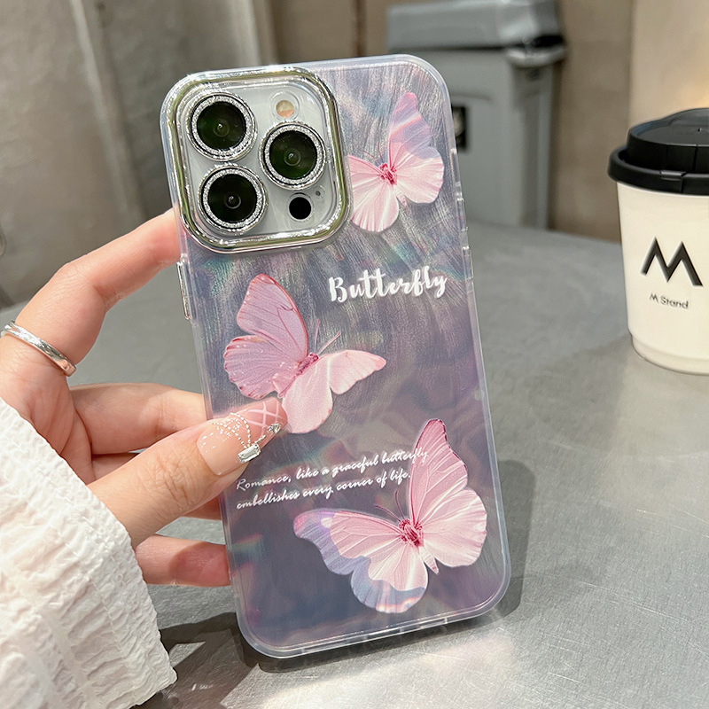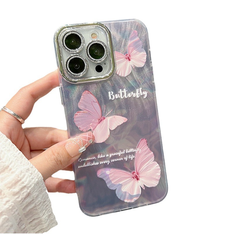 羽纱电镀苹果手机壳15pro max三只蝴蝶14plus保护套13pro粉色精孔