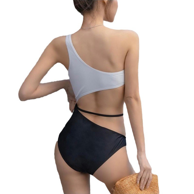 性感镂空露背单肩拼色线条中腰显瘦聚拢少女小清新温泉连体泳衣