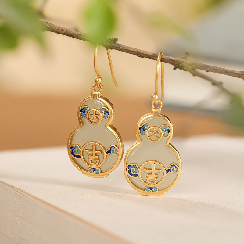 S925纯银镀金和田玉复古景泰蓝珐琅祥云葫芦吊坠耳饰套装