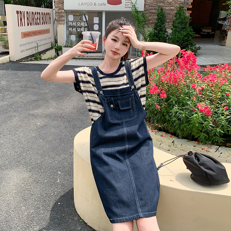 时尚T恤条纹牛仔背带裙套装女夏季新款休闲减龄连衣裙两件套