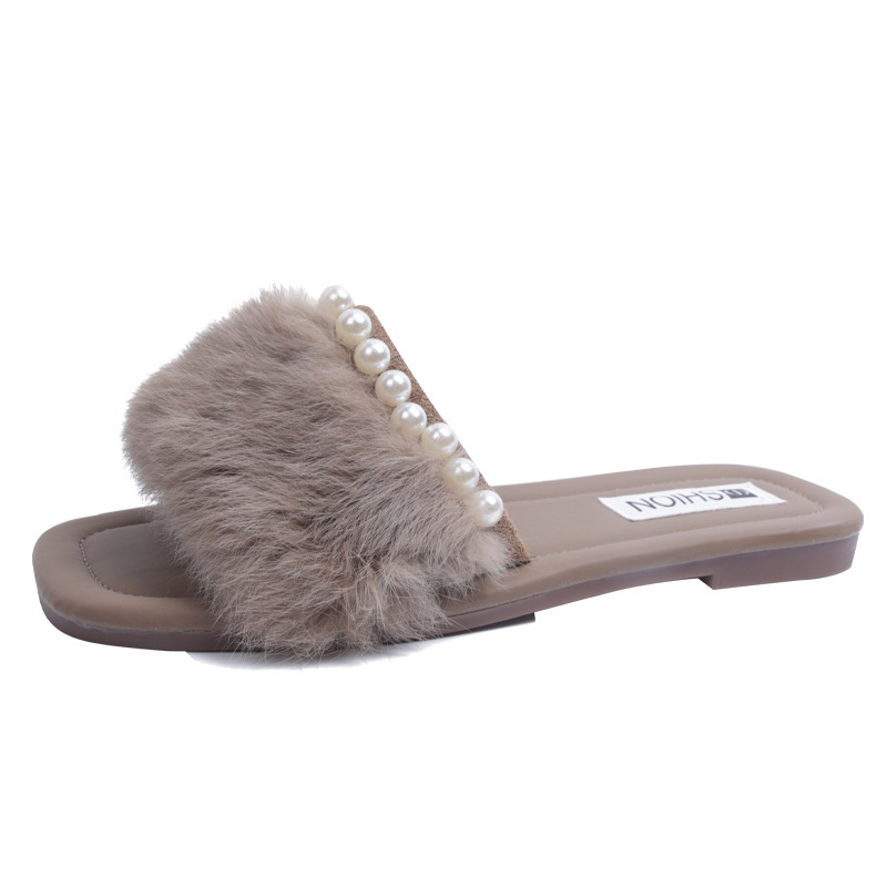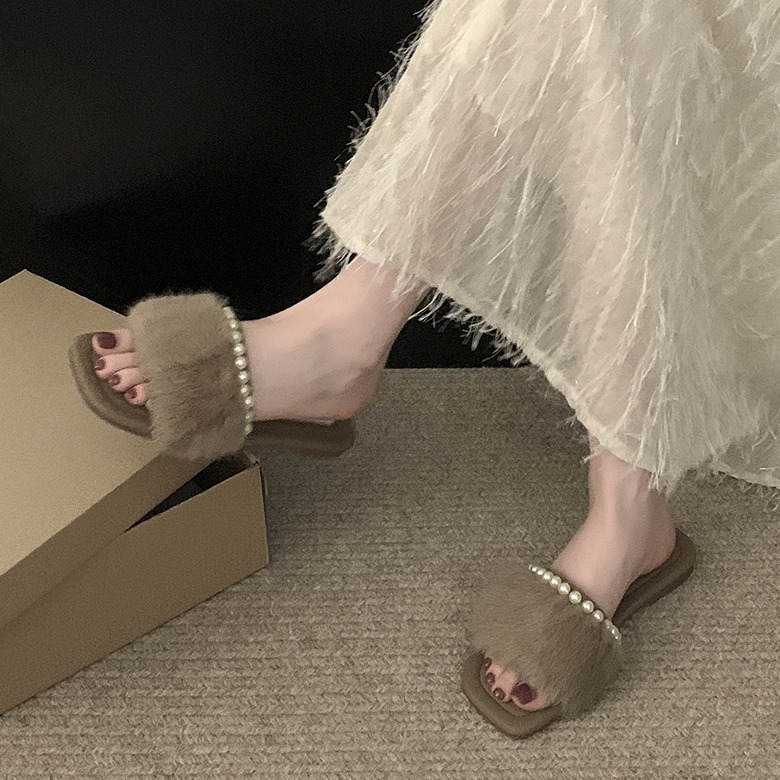 法式配裙子平底拖鞋女夏外穿新款高级感软底一字型毛毛凉拖